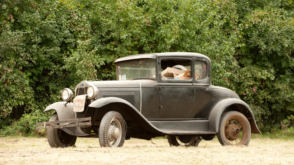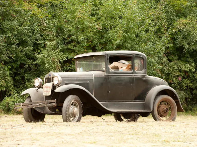This vehicle is mostly complete and in need of restoration. It has a solid body and poor fenders.