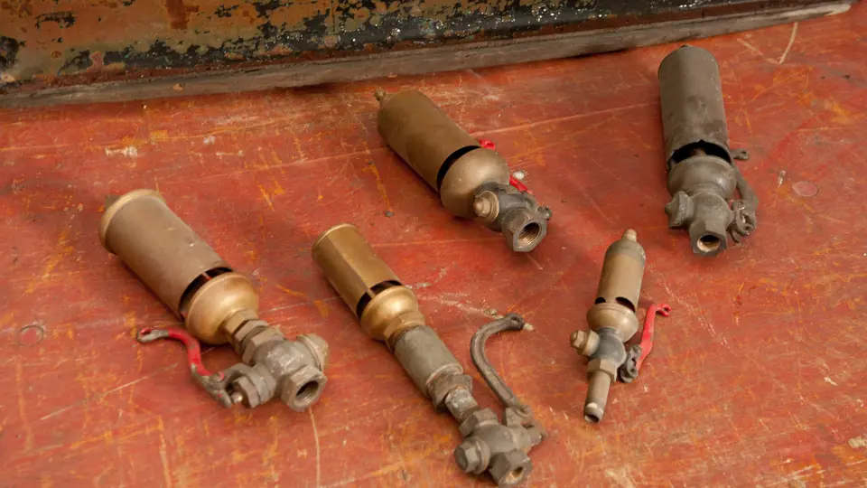 Five antique brass steam whistles.
