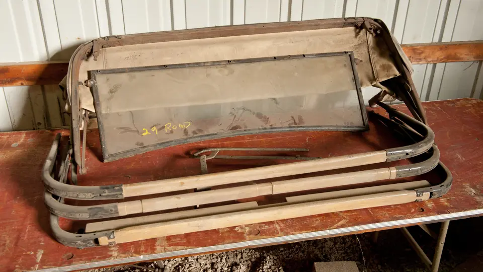 Two Ford Model A roadster top-bow sets, one open car windshield, and one partial top iron.