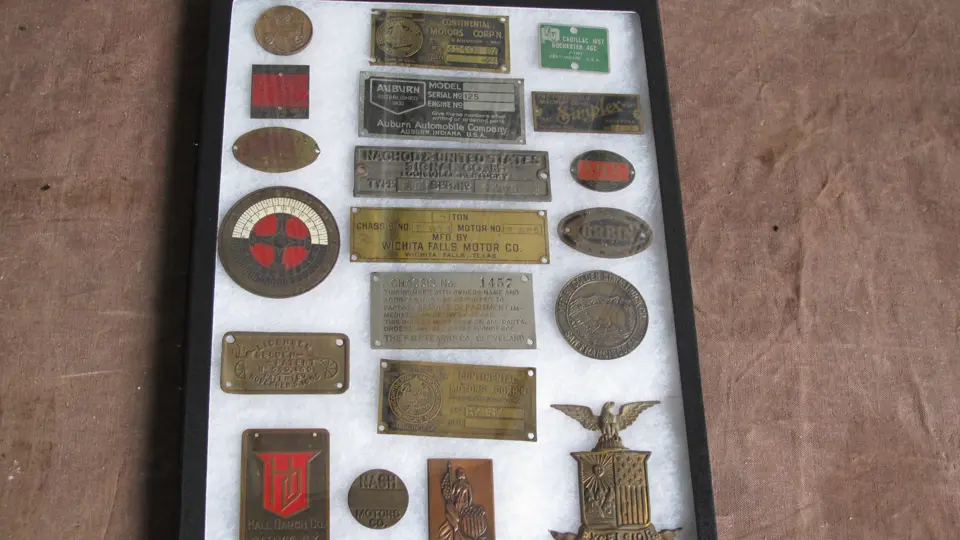 Group of chassis serial plates, tags, and badges including Simplex, Auburn, and Stearns.