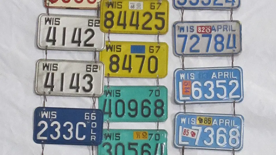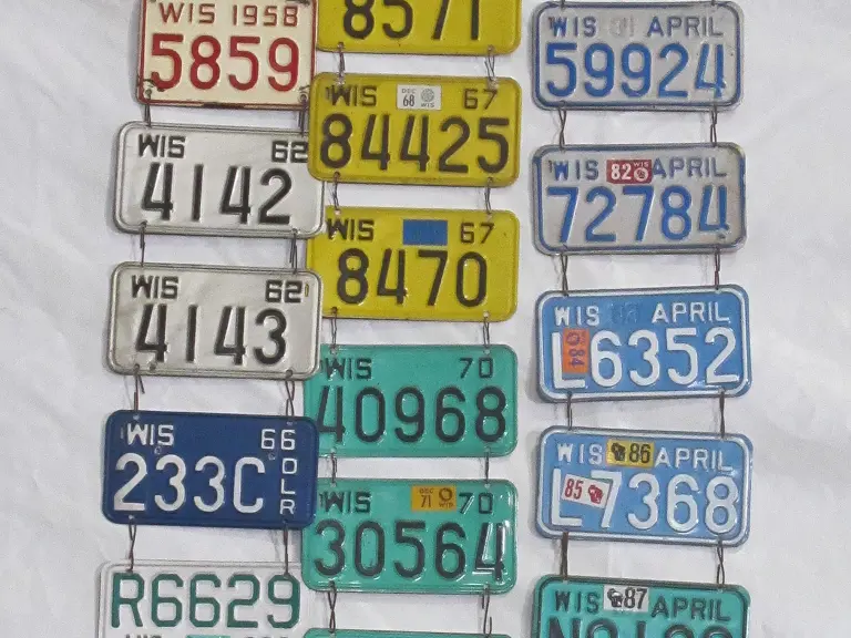 Wisconsin motorcycle plates beginning in the 1950s and stretching through the 1970s, some years absent and duplicates are included. Approximately 40 license plates in the lot.