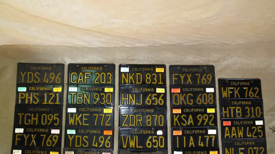 California license plate lot including approximately 24 single, non-matching black plates in varying conditions from the 1960s.