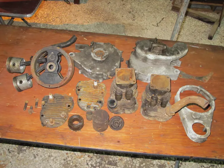 Assortment of engine parts from an Indian 101 Scout all from the same engine.