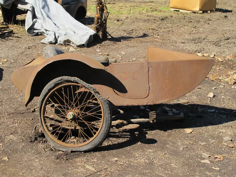 Goulding sidecar with body and chassis. An Excelsior motorcycle logo remains visible on the door.