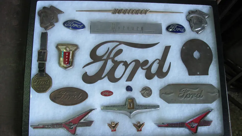 Ford badging including an early brass Model T radiator script.