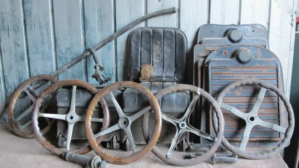 Antique car parts including jump seats, steering wheels, winter fronts, an accessory front bumper, and a gasoline pressure pump.