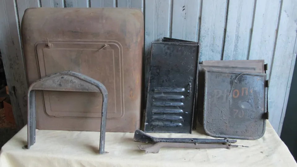 Ford Model T parts including a roadster turtle deck, a low hood, doors, and 23-25 open car windshield posts.