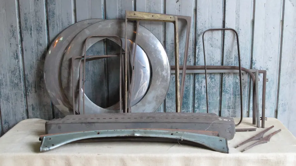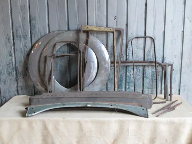 Ford Model A parts, including a pair of 19" tire cover face plates, a 1928-29 roadster-phaeton dash rail plus miscellaneous body trim parts including garnish moldings and sun visors.