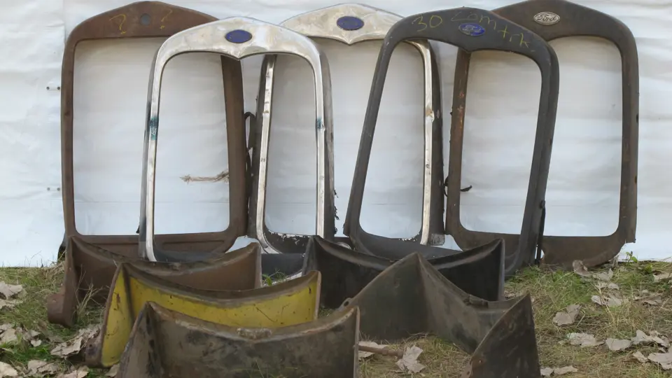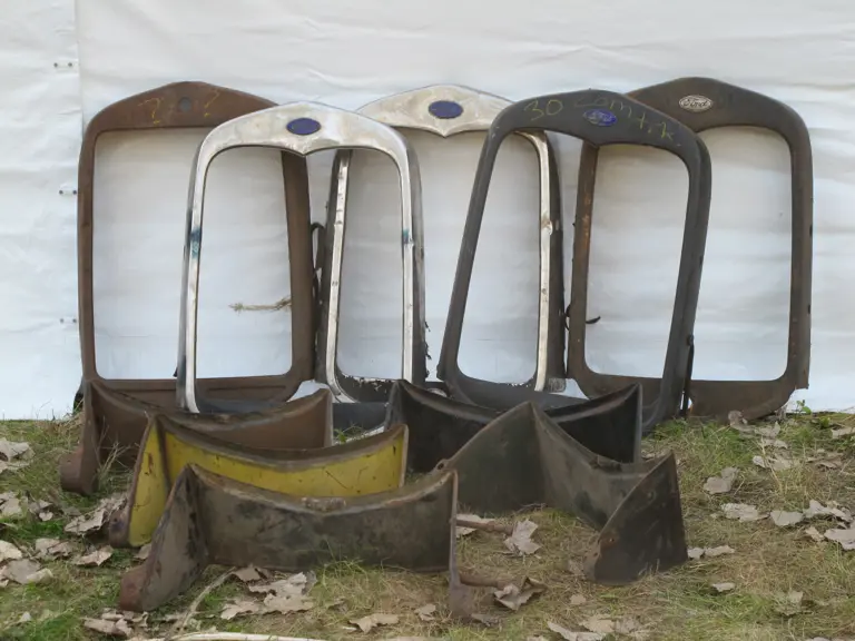 1930-31 Ford Model A parts including five radiator shells and five radiator splash aprons.
