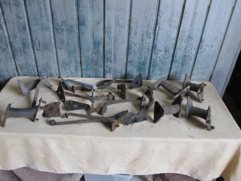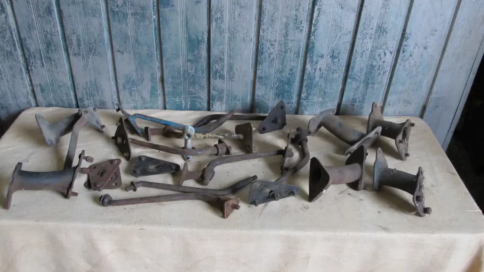 Model A Ford side-mount spare tire irons and coupe roadster rear spare tire brackets.