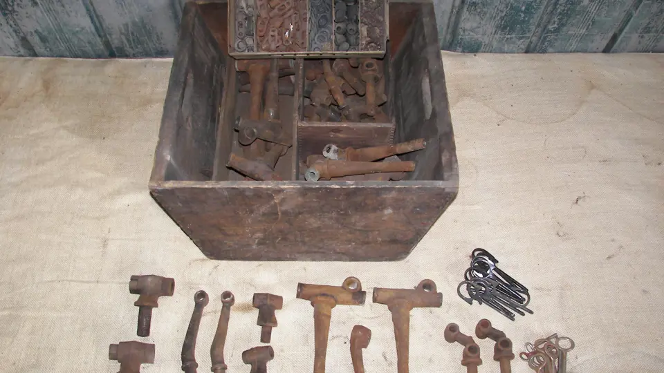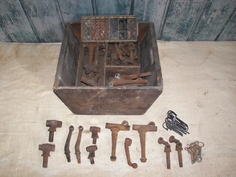 Wooden box containing a group of NOS Ford Model T chassis parts including spindles, steering arms, and front and rear spring perches, as well as a group of turtle deck keys.