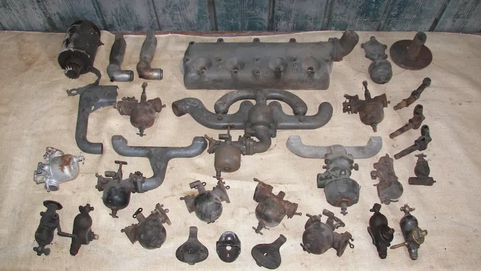 Ford Model T parts including an accessory intake manifold, a group of carburetors, a generator, cylinder head, sediment bulbs, and miscellaneous other items.