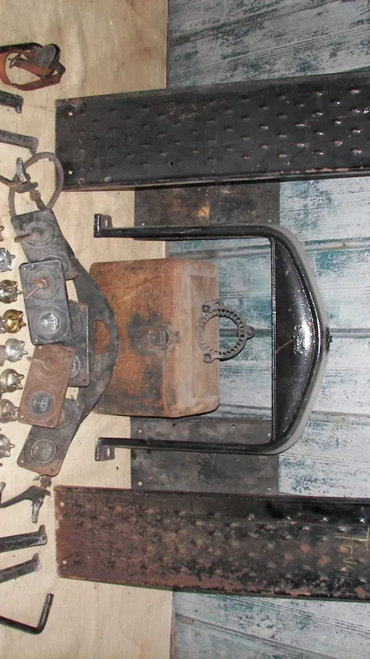 Ford Model T running boards, instrument and dash panels, radiator caps, a grille shell, and running board tool box, plus other miscellaneous items.