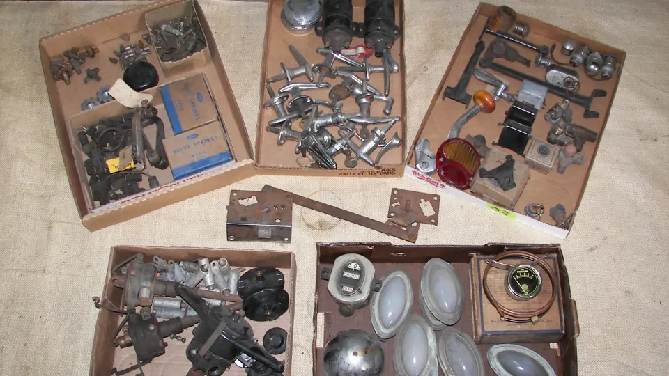 Interesting Model A parts, some NOS, including a cabriolet door latch assembly, accessory oil pressure gauge, truck mirror brackets, shut off valve, deck lid handle and miscellaneous parts.