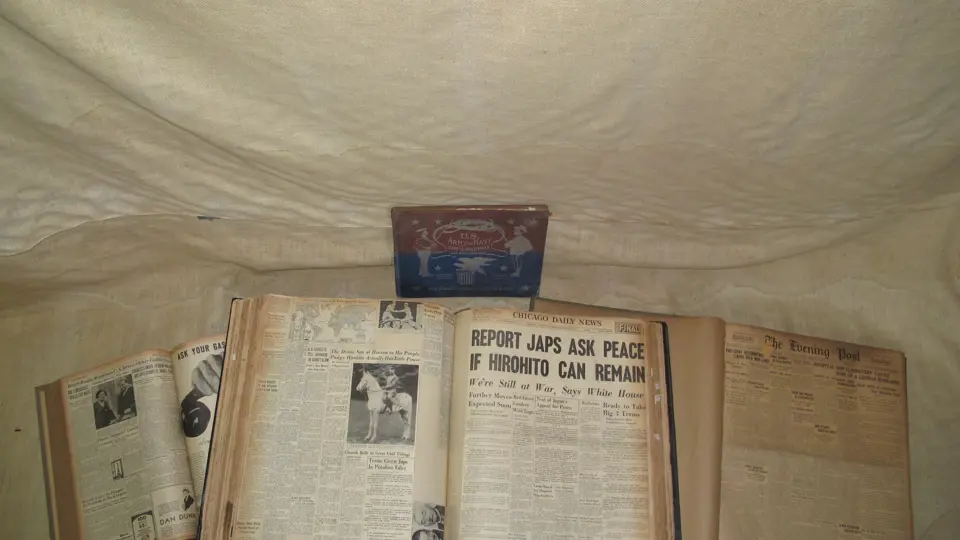 Oversized scrap book containing thousands of newspaper clippings pertaining to WWII events together with a bound group of New York Evening Post newspapers from 1918 and a bound group of New York Evening Post newspapers from 1933.