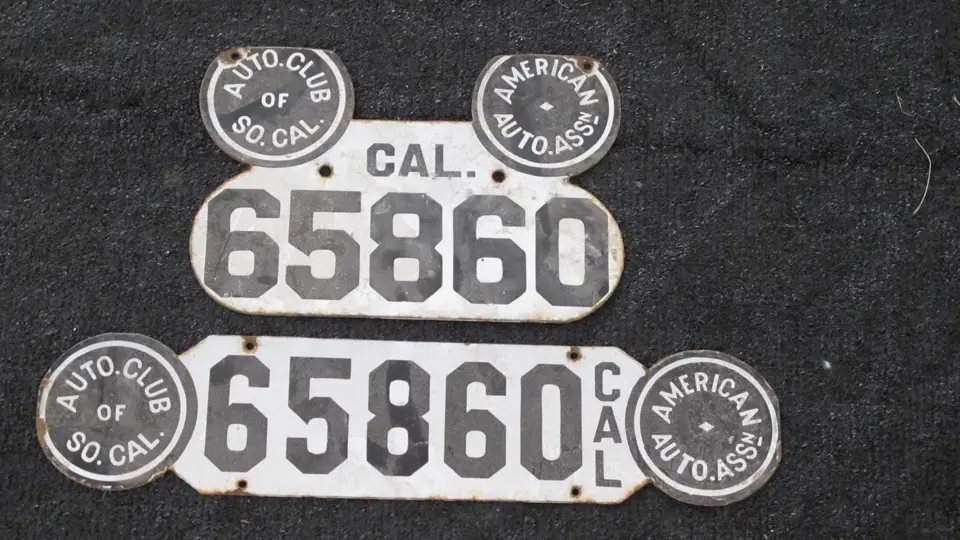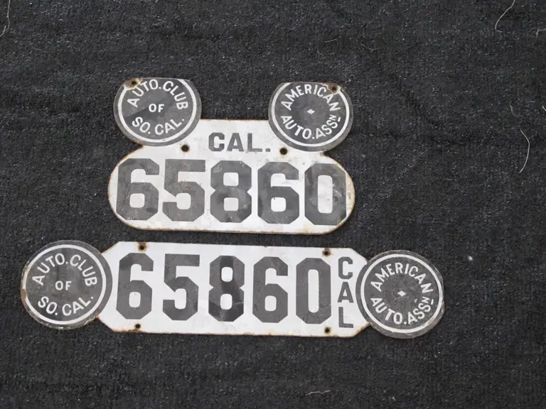 Lot includes a matched pair of porcelain California license plates numbered "65860" in the shape of "Mickey Mouse" and "Dogbone."