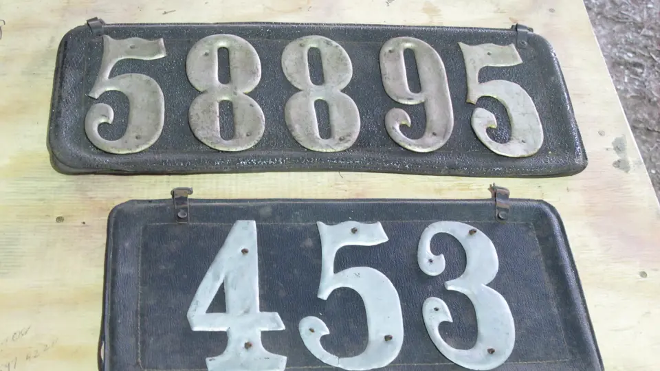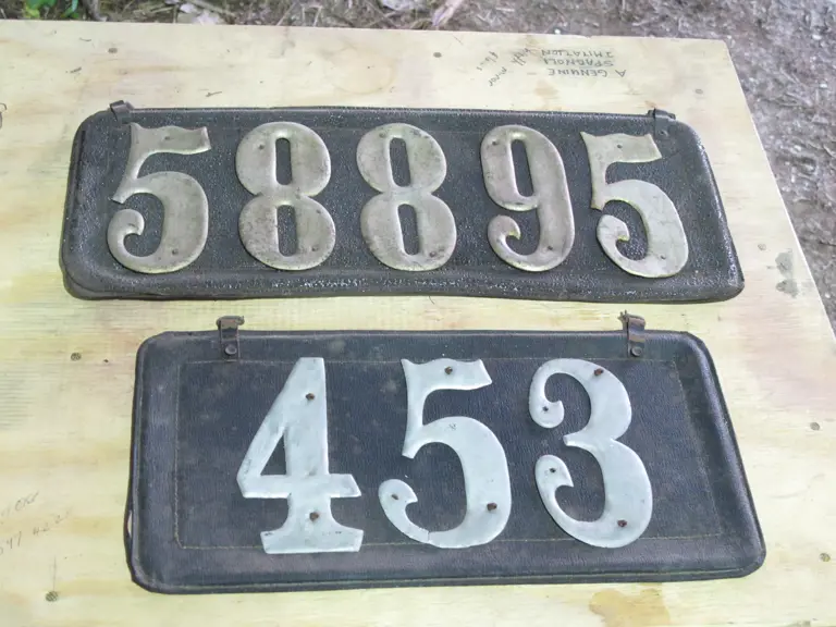 Lot includes 2 what are believed to be leather pre-state Texas plates, one numbered "58895" and the other "453".