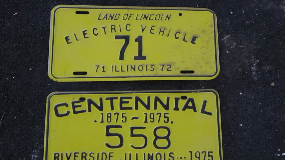 Lot includes a 1971-72 electric vehicle 2-digit license plate and a centenial 3-digit 1875-1975 Riverside, Illinois license plate.
