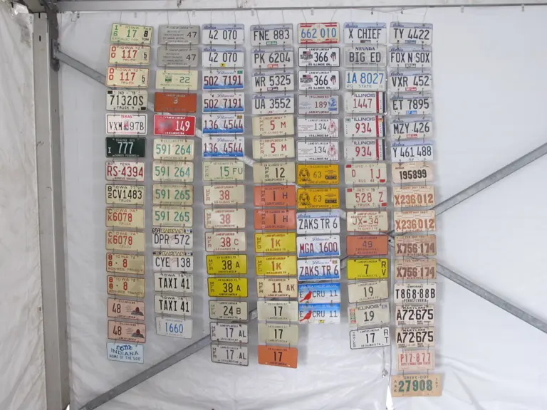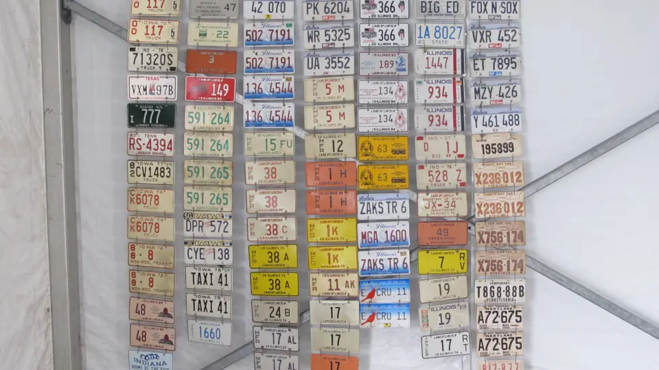 Lot includes approximately 85 Illinois license plates, including numerous manufacturer plates from the 1970s, as well as several vanity plates, themed examples, and several assorted plates from other states.
