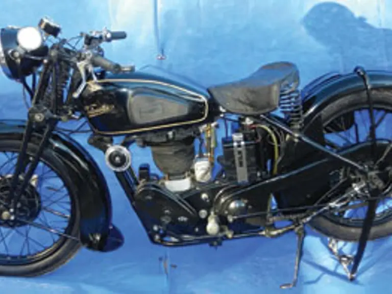 The Velocette MSS was launched in 1935 as a 500cc sports version. World War II halted production which did not resume until 1954. The new MSS was a much more modern machine with the same frame as the Velocette MAC and was fitted with sidecar lugs and had optional panniers to appeal to the touring market. Buyers started tuning the MSS for speed, however, and the factory responded by producing the sports Velocette Venom model. In 1955 a scrambles version was also produced. Burt Monro from New Zealand, featured in the film "The Worlds Fastest Indian" raced a heavily modified 1936 Velocette MSS. Racing preparations including making special pistons, changing the frame and increasing engine capacity to 650cc. His top speed record on this motorcycle was 138 mph. with a 1/4 mile time of 12.31 seconds. This fine example is reported to be an excellent runner and fun to ride. Selling on a bill of sale and without reserve.