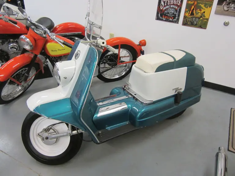 Authentically restored 9 HP motor scooter with Strato Blue and White paint scheme and period correct seat cover and accessory windshield. Second year production. Excellent bike for any collection. Has been on static display in private collection. Selling with Bill of Sale and no reserve.