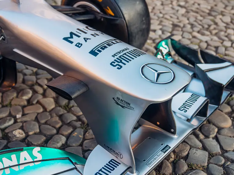 The amalgamation of hundreds of millions of dollars and thousands of hours in research and development, chassis F1W04-04 embodies the race-winning legacy of Mercedes’ celebrated Silver Arrows, powered by the last of the naturally aspirated engines and with technological innovations unfathomable to its forebearers. Serving as the primary car for Lewis Hamilton throughout the 2013 season, and the car in which he achieved his first win with Mercedes, chassis F1W04-04 is the ultimate motorsports collectible, playing a pivotal role in Formula One’s all-time winningest driver’s start with Mercedes and marking the beginning of the next Silver Arrow dynasty. This significant racecar embodies the genesis of an important era in Formula One and Mercedes-AMG history. It symbolizes a passing of the baton from one all-time racing great—Michael Schumacher—to another, representing the cornerstone of the Hamilton legend, one which cannot be repeated and will forever occupy a prized place in the annals of Formula One lore.