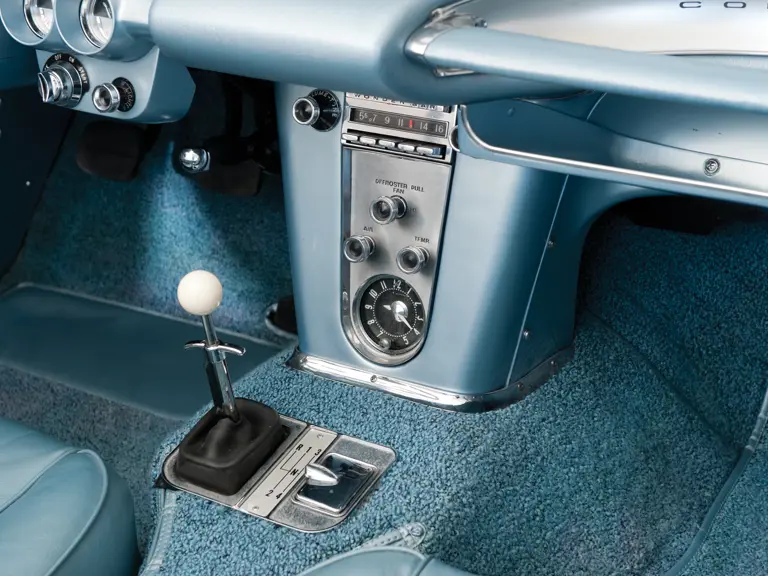 La voiture que nous proposons est équipé du V-8 de 270 ch avec l'option de transmission la plus désirable : une boîte quatre rapports. Elle est dotée aussi d'un autoradio Wonderbar et d'un hard-top amovible, ce qui permet une utilisation tout au long de l'année. Contrairement à de nombreuses Corvette de cette époque, qui arborent des teintes voyantes, celle-ci présente un beau Horizon Blue avec moulures blanches et une sellerie turquoise léger. Sous le capot, le moteur est frappé du numéro 105903, ce qui correspond à la pratique Chevrolet, commencée en 1960, de choisir pour le moteur un numéro correspondant aux six derniers chiffres du numéro de châssis de la voiture.