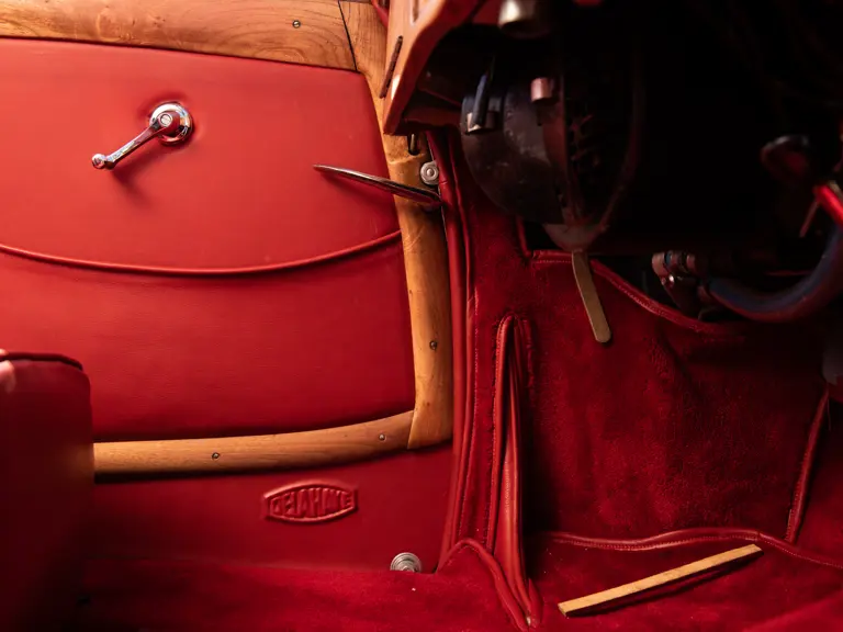 This example, chassis 800390, was commissioned by Chiron in “MS” specification. Included in the history file is a letter from Chiron to Chapron dated 2 November 1946, within which the Bugatti man confirmed he had received the drawings for the coachwork and was happy with them, so asked Chapron to commence construction of the body, also that should there be any changes, he will meet him in Paris to discuss. According to copies of Chapron’s records, chassis 800390 entered the carrossier on 4 December 1946, where it was bodied as a two-door Sport Coupé featuring “torpedo wings”. The body was painted in two-tone “bleu ciel” over blue Miami and the interior upholstered in red leather. Chiron specified in a letter to Chapron that a loud foot-operated horn should be installed. A Delahaye inspection note confirms the car had completed its checks and was signed off on 9 April 1947. Chiron was sent an invoice by Chapron on 15 July 1947 for the construction of the car, which totalled an impressive 550,000 francs after a 100,000-franc discount.