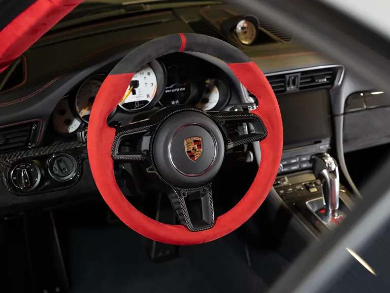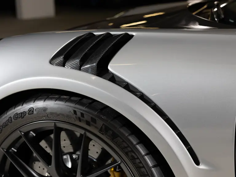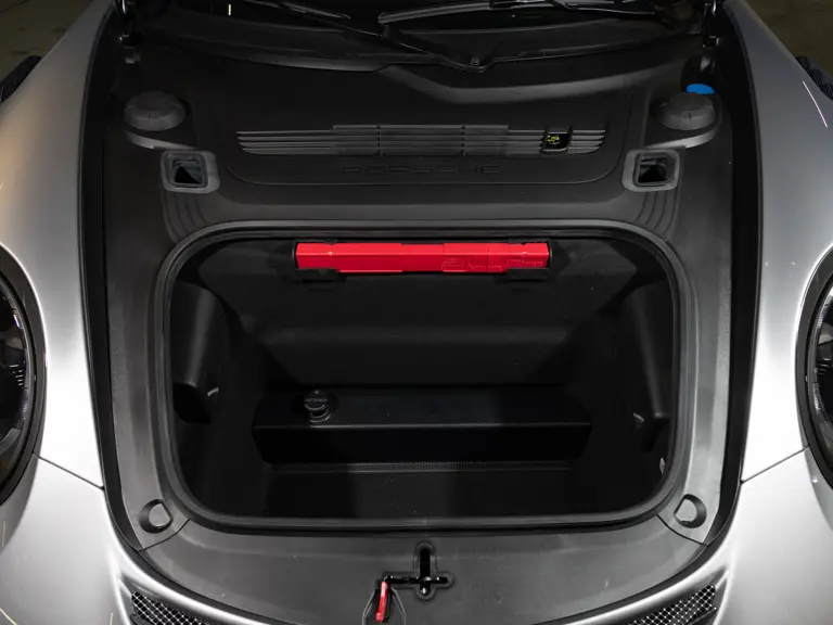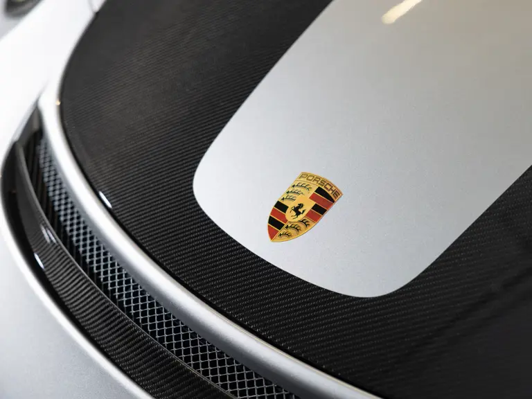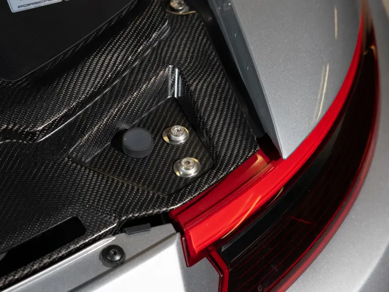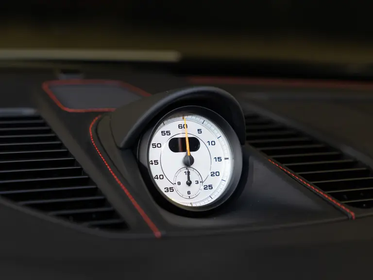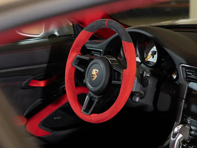 Delivered to Switzerland on 14 November 2018 via Porsche Zentrum Zürich, this car is finished in GT Silver Metallic. Notably equipped with the “Weissach” package, it wears Satin Black forged magnesium centre-lock wheels that combine with a carbon fibre roof, anti-roll bars, and coupling rods to save 30 kilograms. The interior, meanwhile, blends Guards Red and Black leather and Alcantara for the Porsche 918 Spyder-specification bucket seats. Further enhancing the cabin, this car was configured with the optional extended leather trim package for the dashboard and centre tunnel, plus white instruments dials and a white-faced Sport Chrono stopwatch.