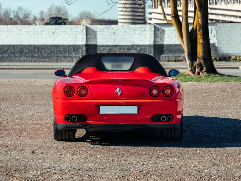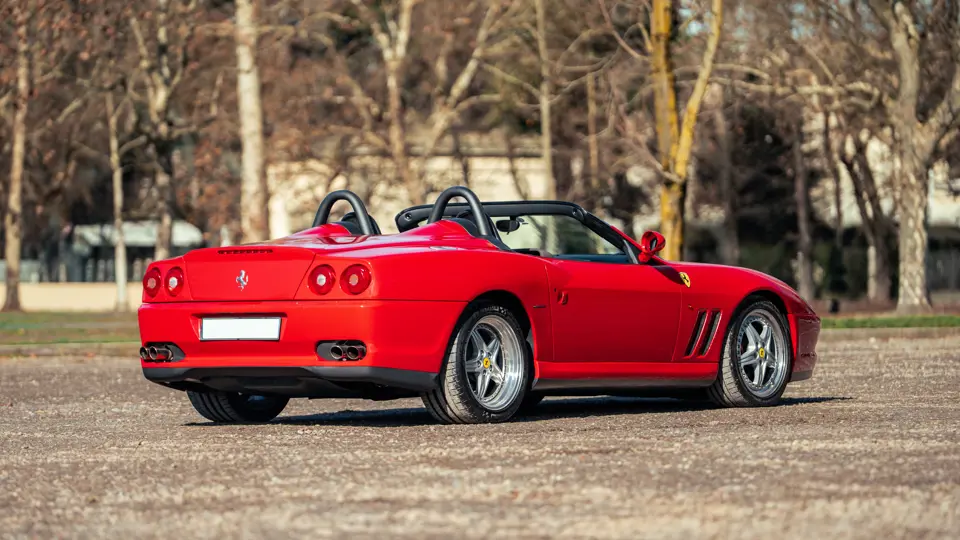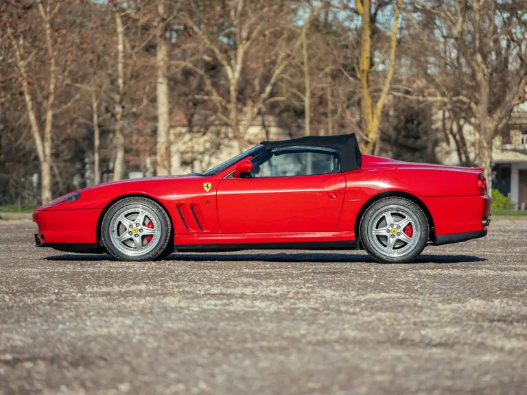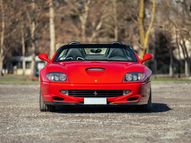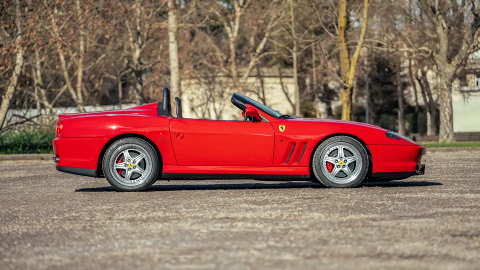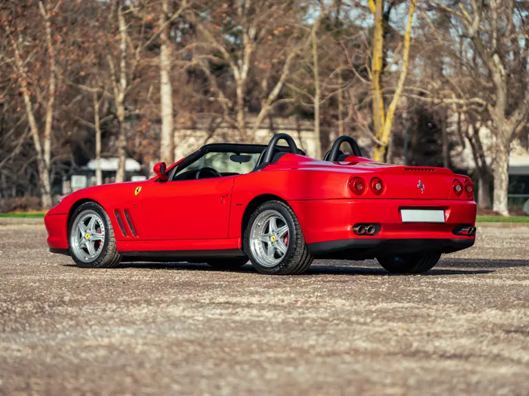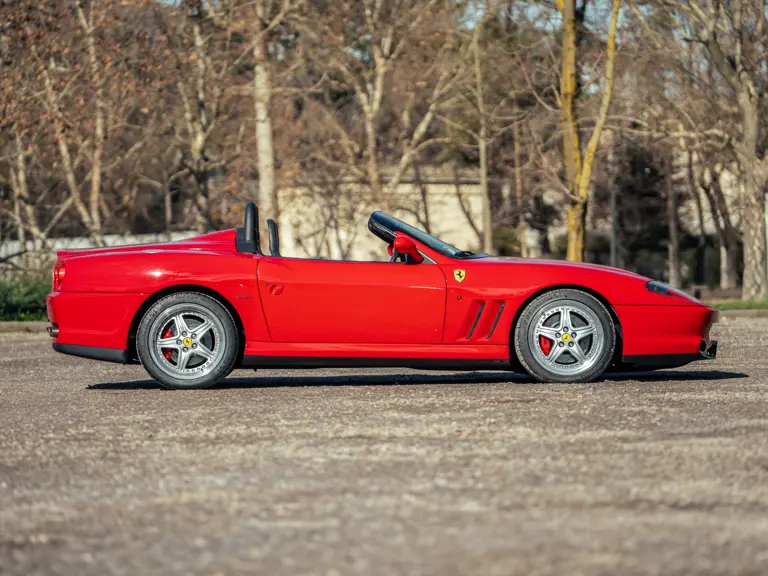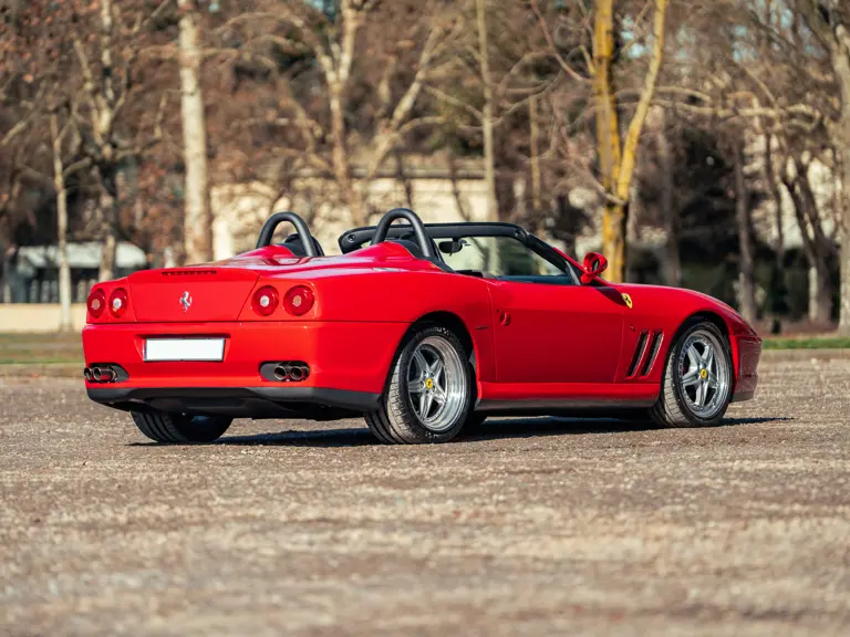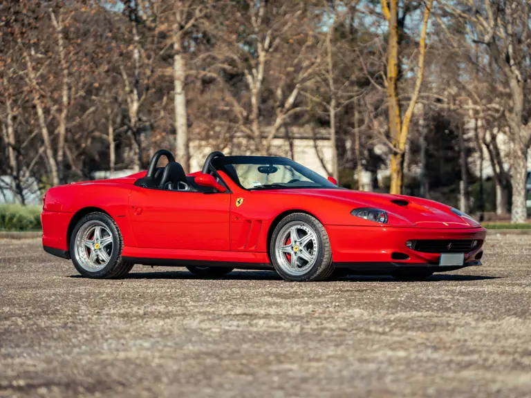 Like the Daytona, the 550 Maranello’s success warranted the production of a limited-edition variant: the 550 Barchetta, designed by Pininfarina, and first displayed at the 2000 Paris Motor Show. With only a rudimentary soft-top for emergency use when caught in the rain, it featured a shorter, more aggressively raked windscreen, two-piece alloy wheels, racing seats, and a restyled rear deck that led to a luggage space surprisingly larger than that of the coupé. Only 448 examples of the Barchetta Pininfarina were built, making low-use cars an attractive proposition to collectors some 25 years on from the model’s limited production run.