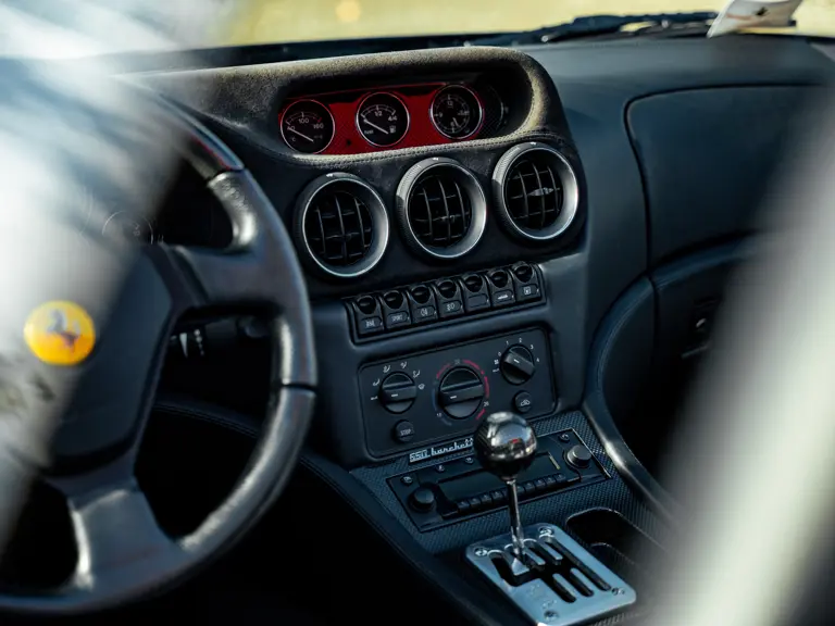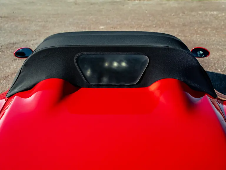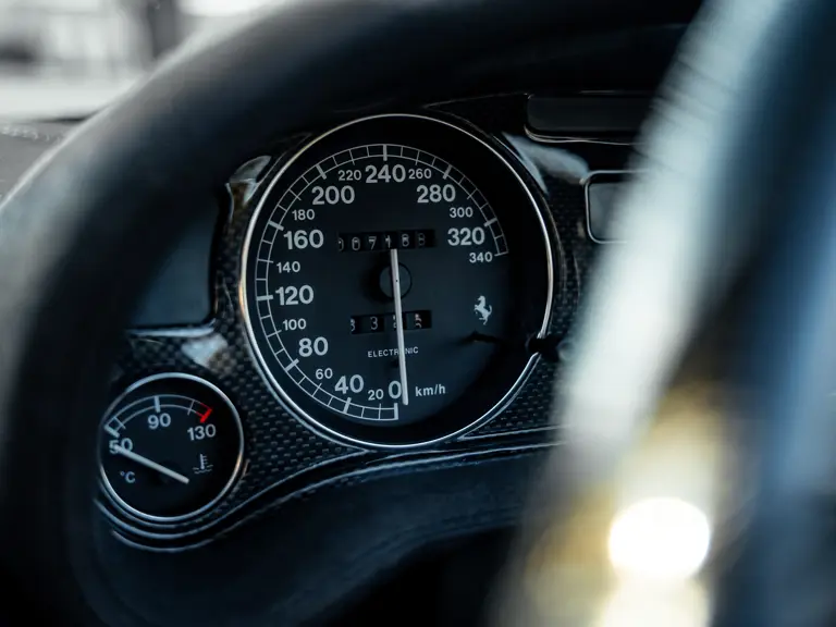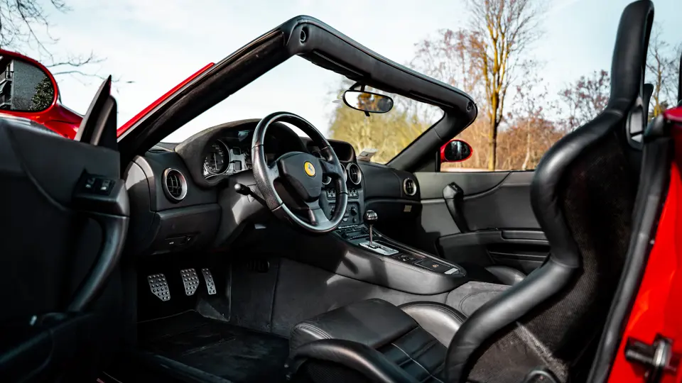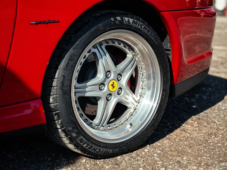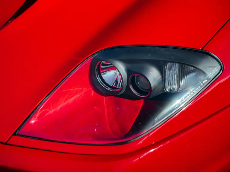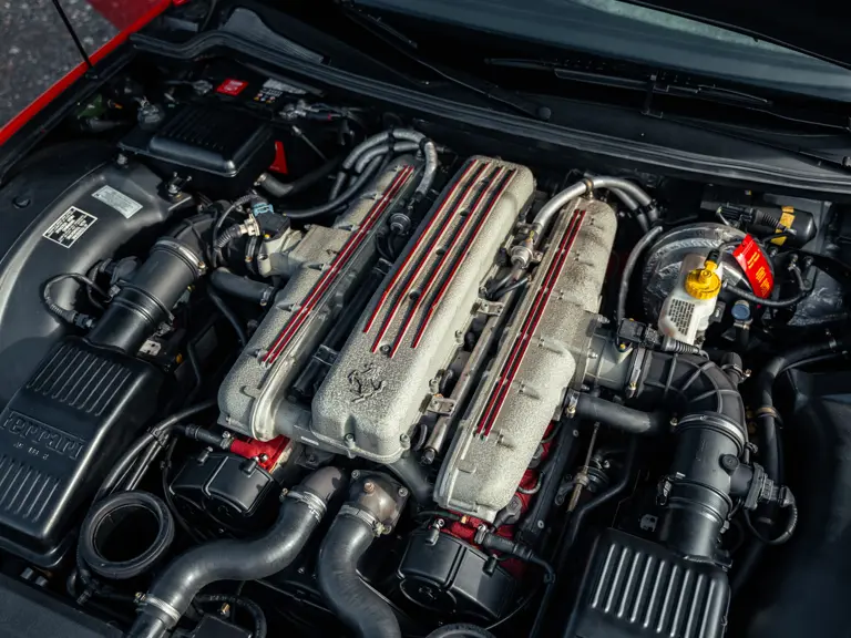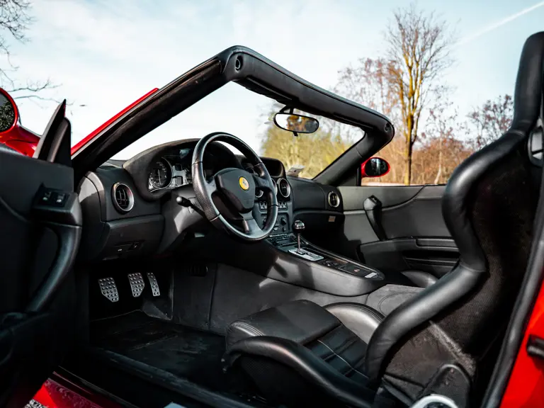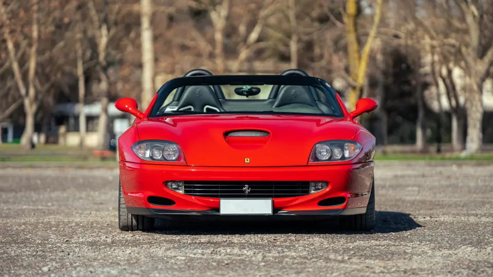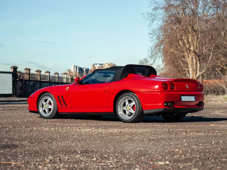 Like the Daytona, the 550 Maranello’s success warranted the production of a limited-edition variant: the 550 Barchetta, designed by Pininfarina, and first displayed at the 2000 Paris Motor Show. With only a rudimentary soft-top for emergency use when caught in the rain, it featured a shorter, more aggressively raked windscreen, two-piece alloy wheels, racing seats, and a restyled rear deck that led to a luggage space surprisingly larger than that of the coupé. Only 448 examples of the Barchetta Pininfarina were built, making low-use cars an attractive proposition to collectors some 25 years on from the model’s limited production run.