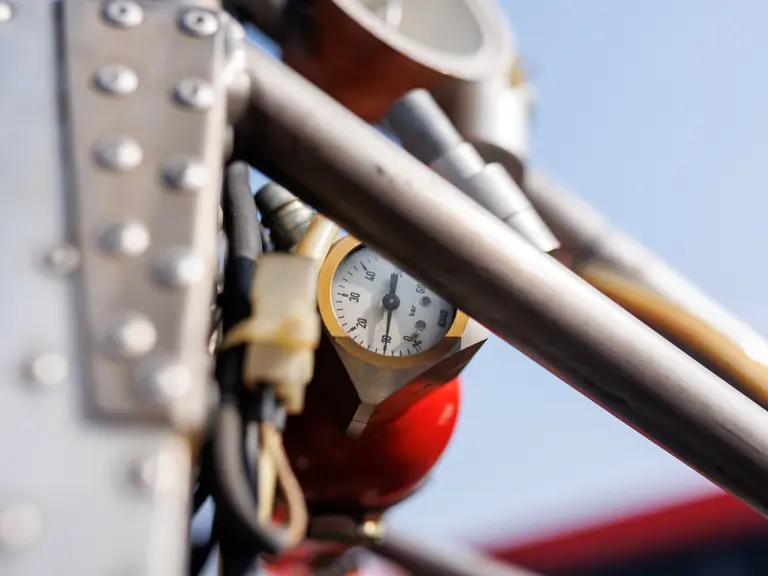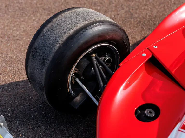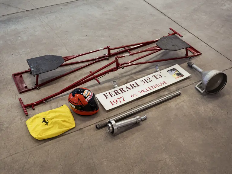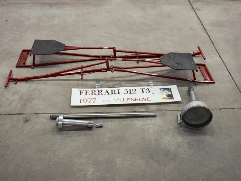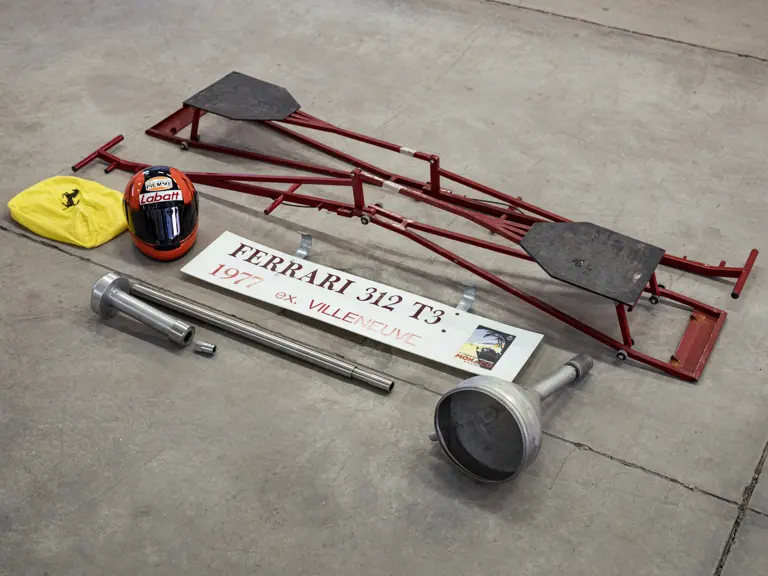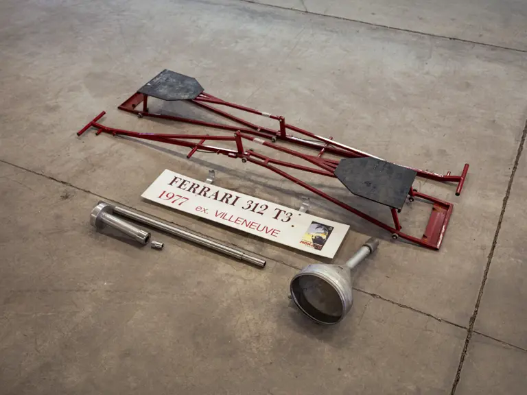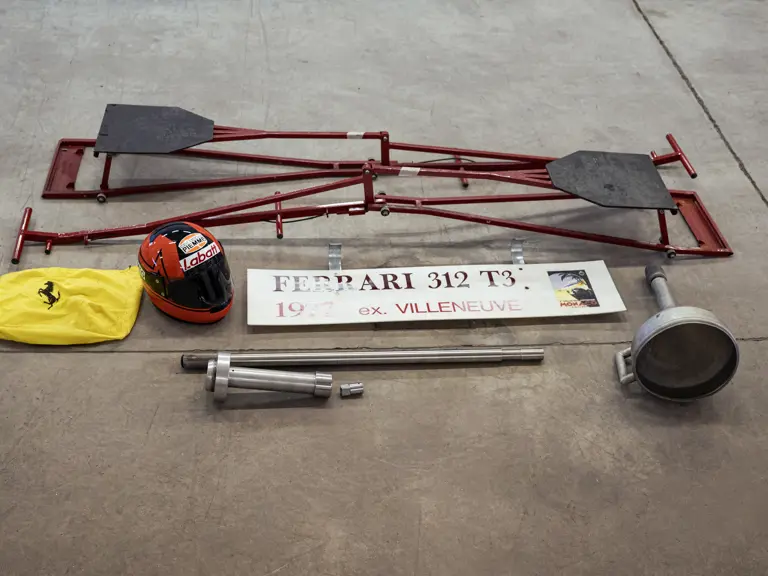 Presented in the race number “12” livery, as campaigned by Villeneuve in Argentina, the 312 T3 is offered for sale complemented by three full-size sets of slick tyres (two Michelin sets, one Pirelli), and four narrow-gauge wheels and tyres to help with manoeuvrability and transport. In addition, the car is supplied with front and rear jacks plus a fuel filler funnel. Prior to returning the car to the race track, it is recommended to have the Ferrari fully checked and its safety devices renewed.