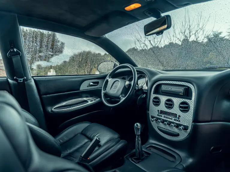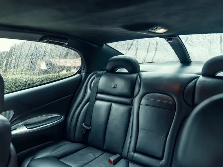 The EB112’s interior accommodates seating for four, with rear seats separated by a fold-down armrest. Headrests are emblazoned with the Bugatti “EB” logotype, and the instrument cluster surround, central dashboard, and door panels sport metal panels accented with a classic Perlée finish. But the interior is otherwise restrained and refined. In many ways it anticipates the cabin of the Bugatti Veyron, which involved Giugiaro and Italdesign in its initial development stages.