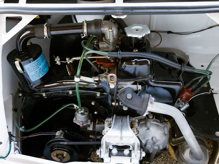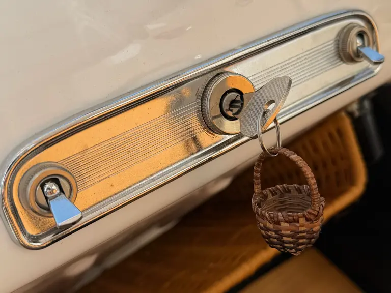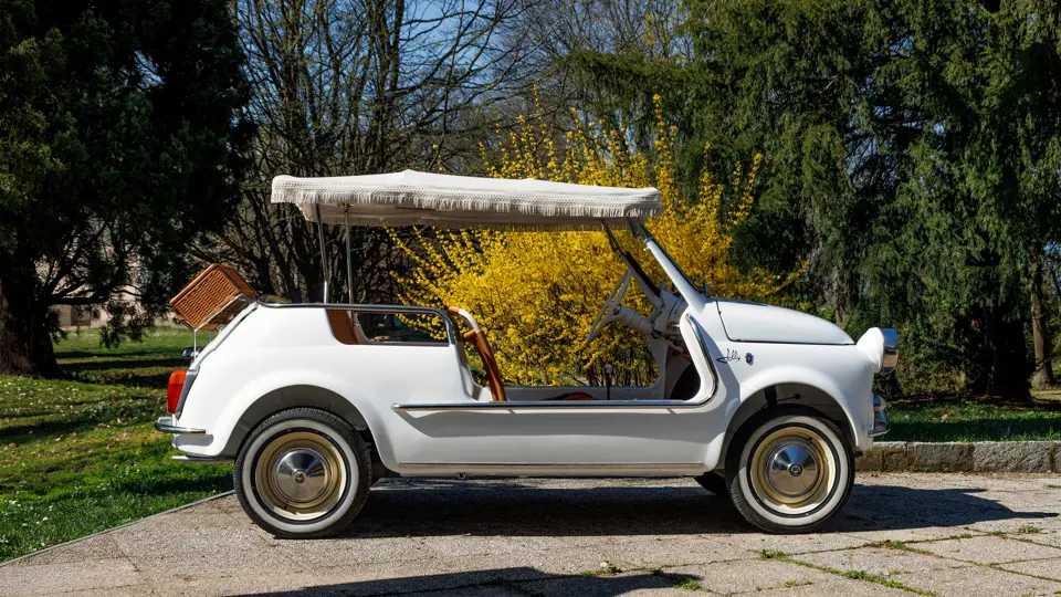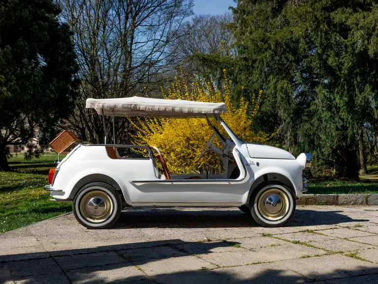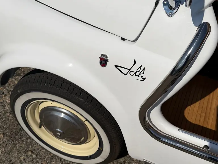The car offered here is a converted Jolly that began life as a 1971 Fiat 500 F/L. Its chassis number sequence falls within the range of cars built at Fiat’s Termini Imerese plant based in Sicily. Later converted to its current form as an ode to the 500 Jolly, the transformation was completed in 2025. A photo on file shows the Fiat midway through its rebuild, with its body stripped bare and ready to be repainted in its current shade of white. The Fiat was put back on the road in Italy with its original Palermo registration (with an amended body type) and was shown to the public for the first time at FuoriConcorso in May 2025. Here, the Fiat appeared in fine company on the shores of Lake Como.