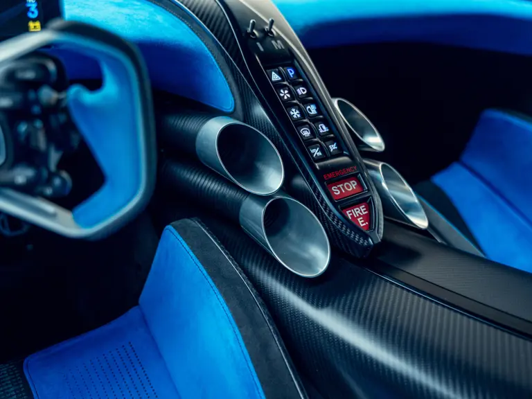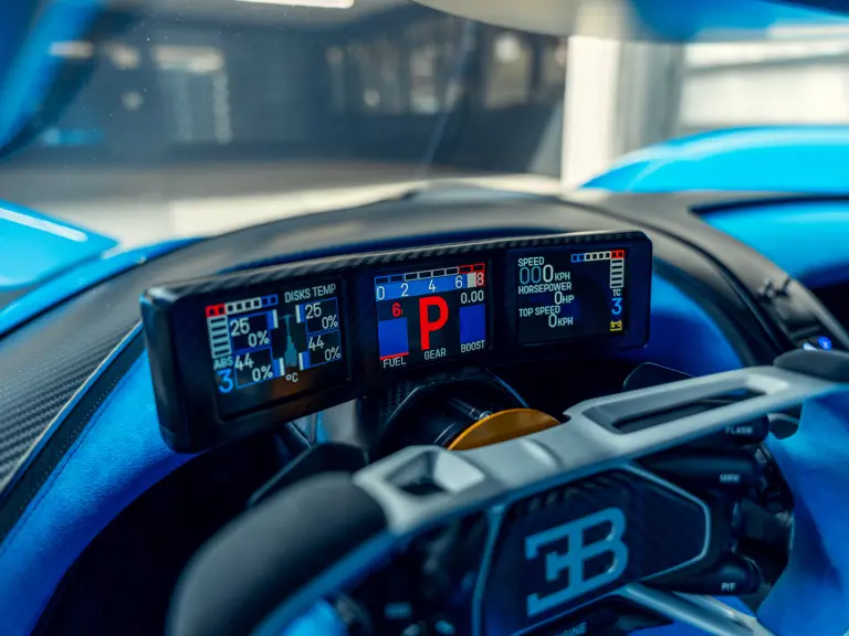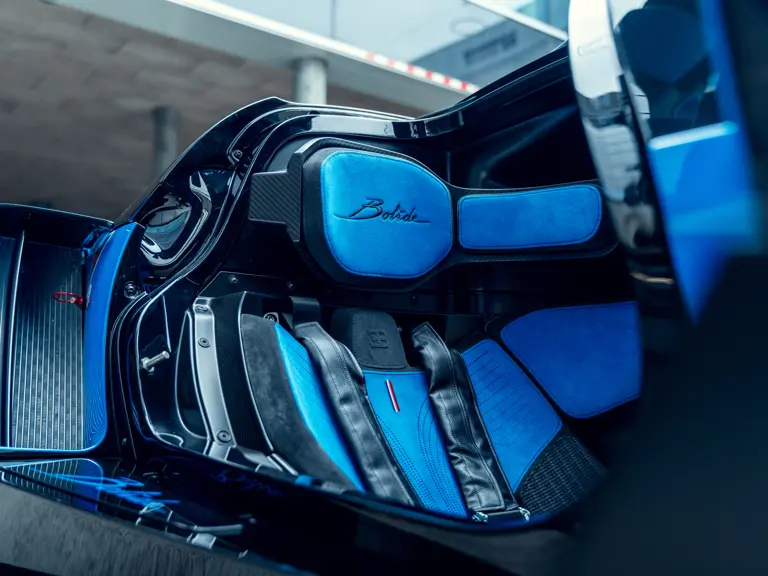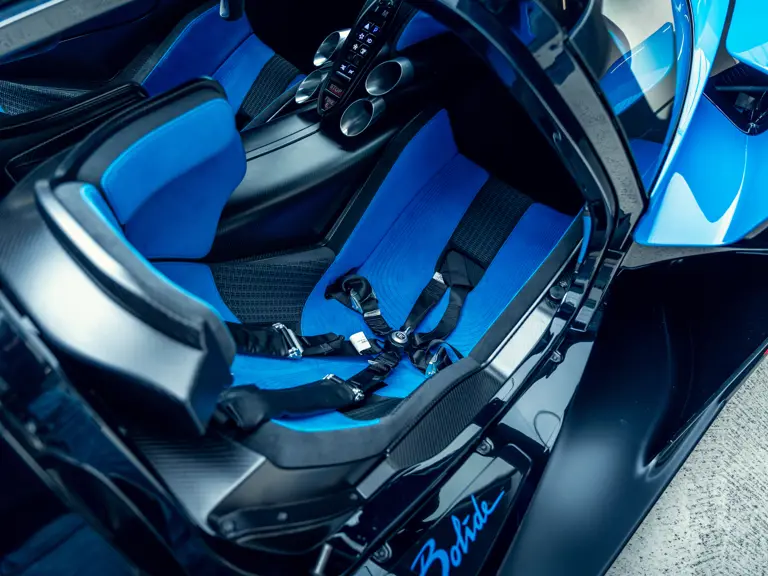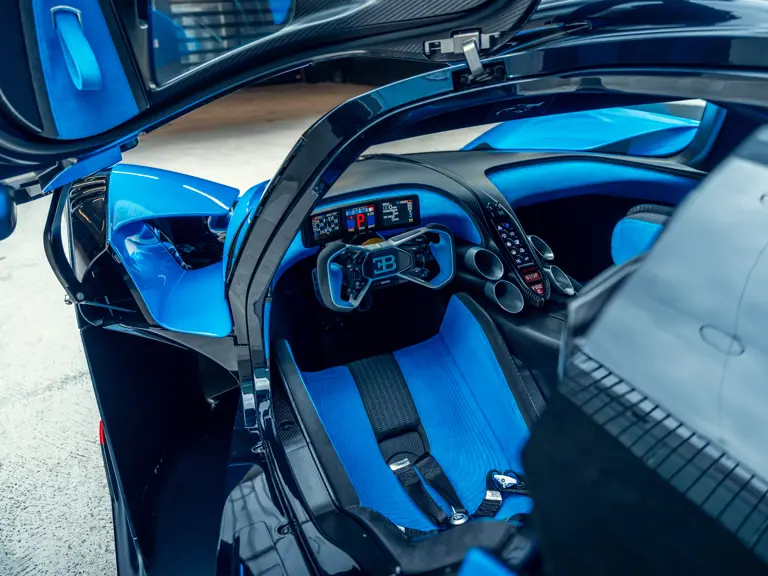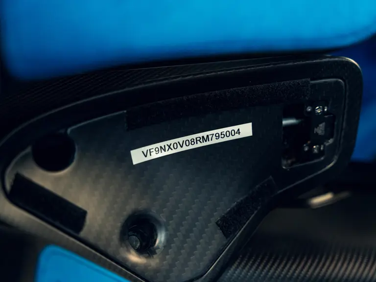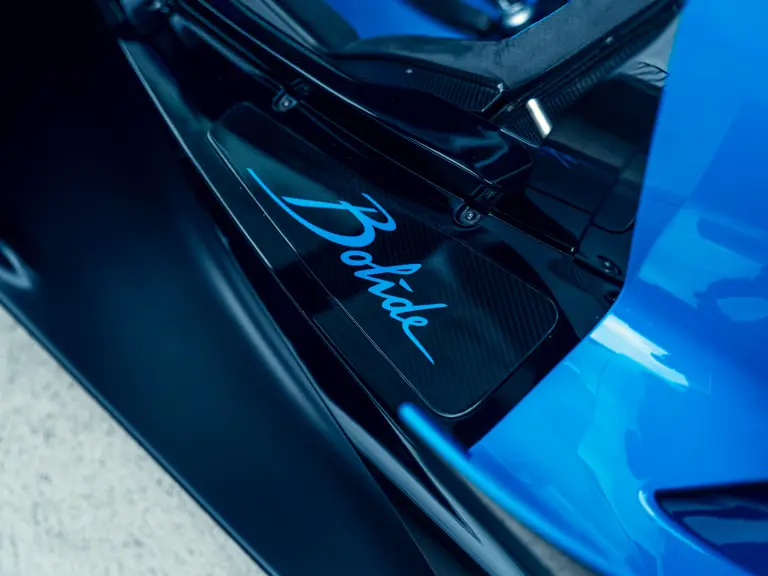 The Bugatti Bolide offered here was specified with a staggering €291,000-worth of optional factory equipment. Its exterior treatment in Bugatti’s signature colour-split motif, a striking combination of Agile Blue tinted carbon fibre and Nocturne paint, accounts for €100,000 of the optional expenses. An additional €55,500-worth of Agile Blue accents and a €7,500 French flag graphic further enhance the exterior colour scheme. Nocturne wheels (€7,500) with black coated wheel caps (€7,500), fuel cap (€5,000), and exhaust deflector (€12,000) complete the presentation.