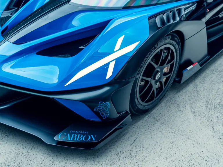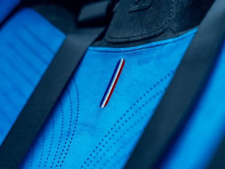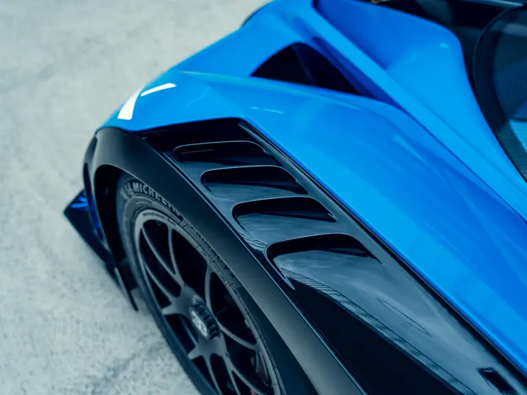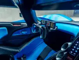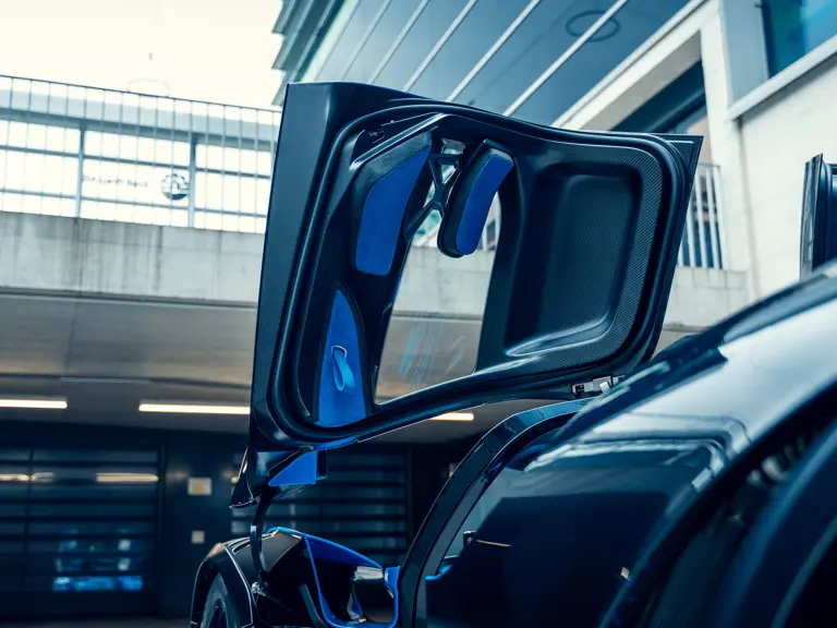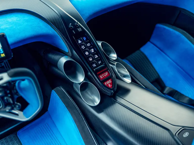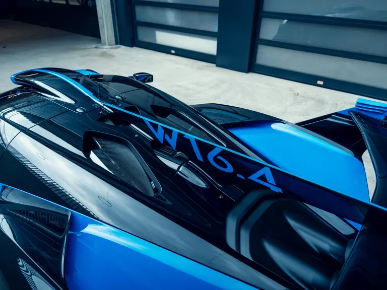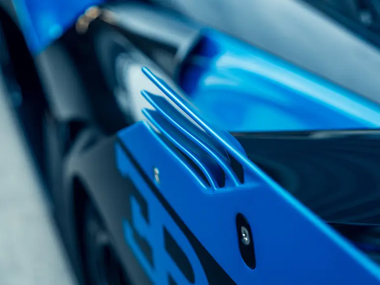 The Bugatti Bolide offered here was specified with a staggering €291,000-worth of optional factory equipment. Its exterior treatment in Bugatti’s signature colour-split motif, a striking combination of Agile Blue tinted carbon fibre and Nocturne paint, accounts for €100,000 of the optional expenses. An additional €55,500-worth of Agile Blue accents and a €7,500 French flag graphic further enhance the exterior colour scheme. Nocturne wheels (€7,500) with black coated wheel caps (€7,500), fuel cap (€5,000), and exhaust deflector (€12,000) complete the presentation.