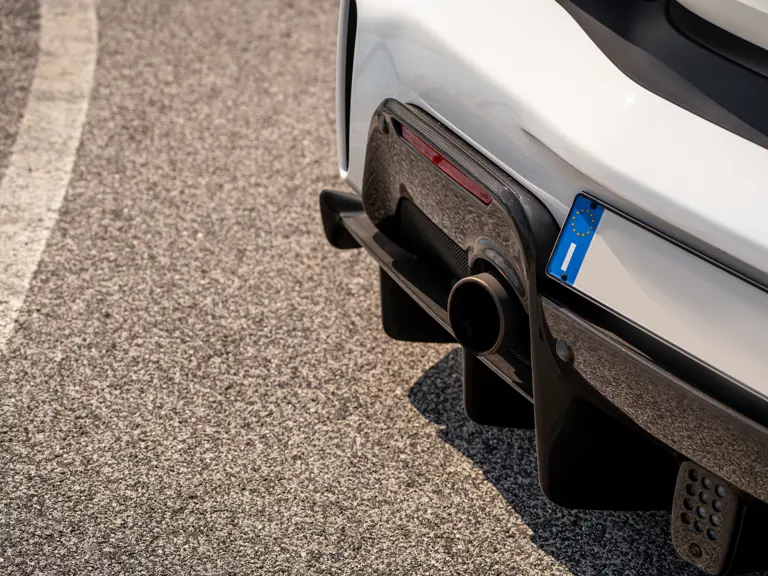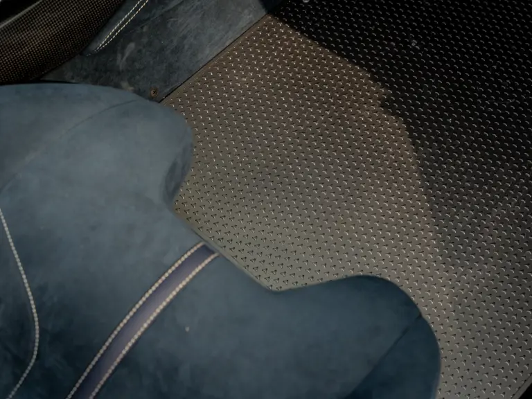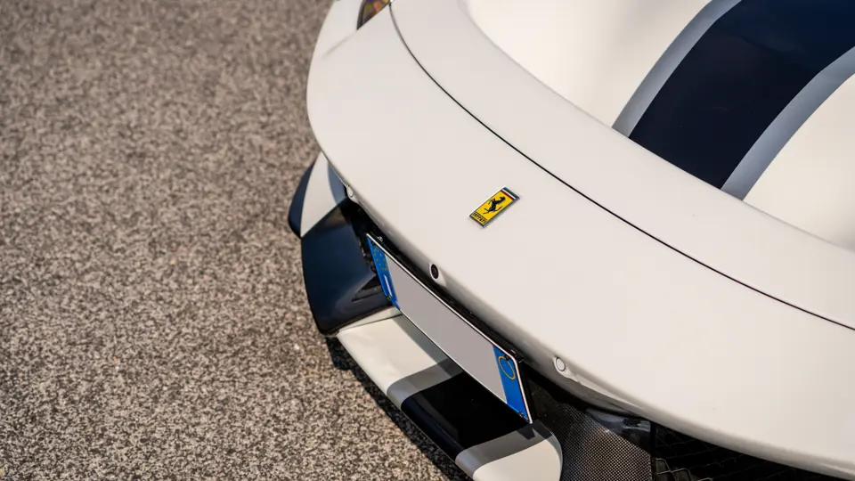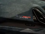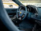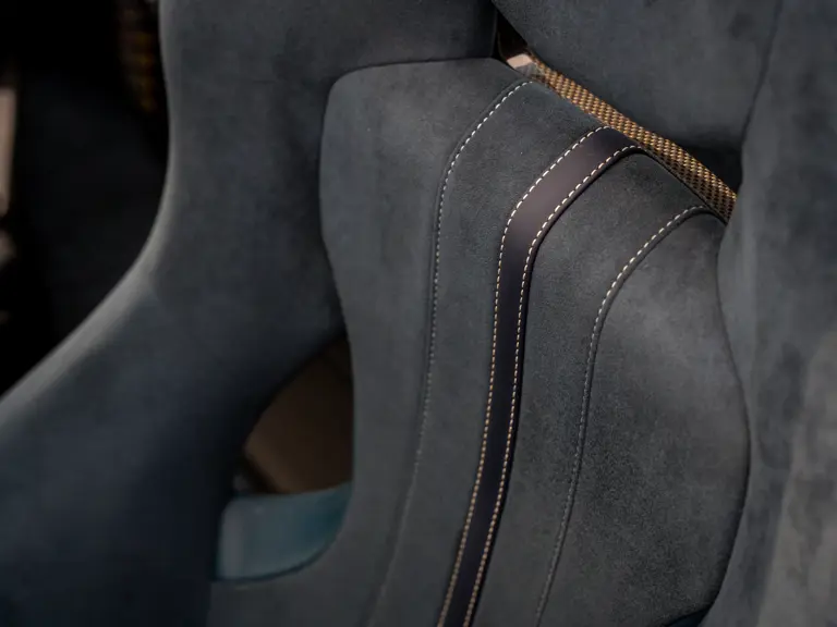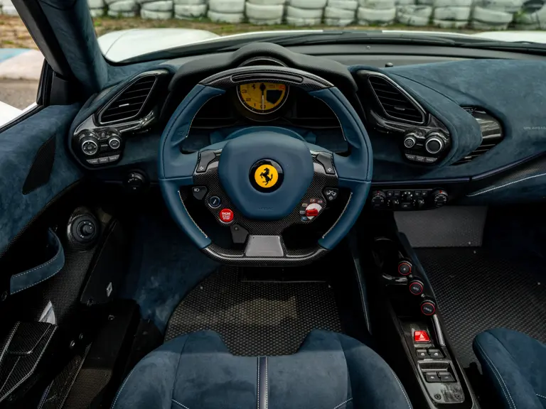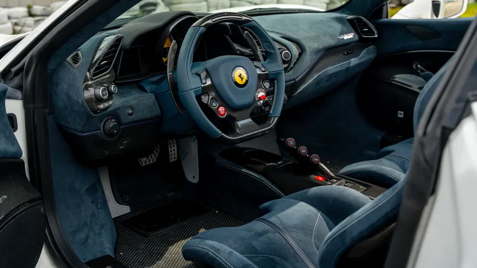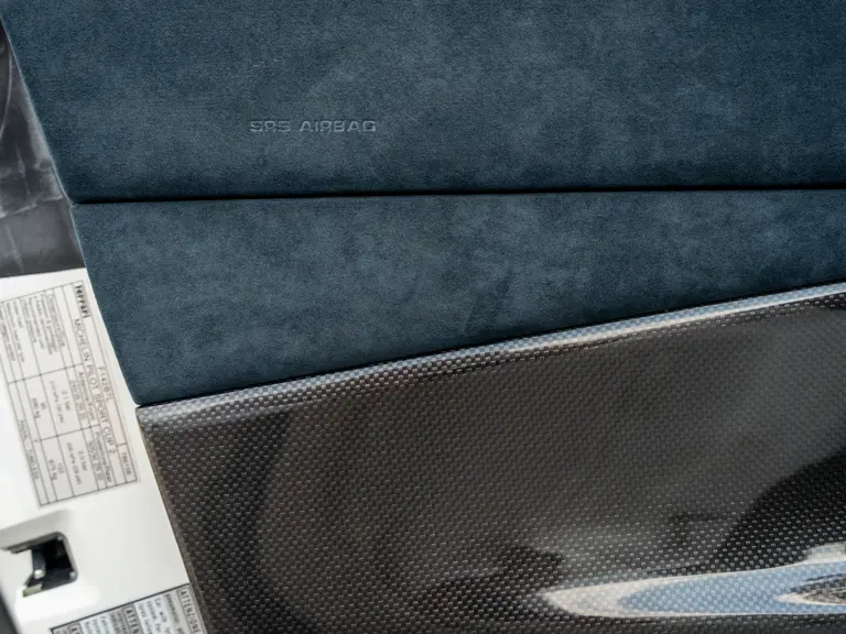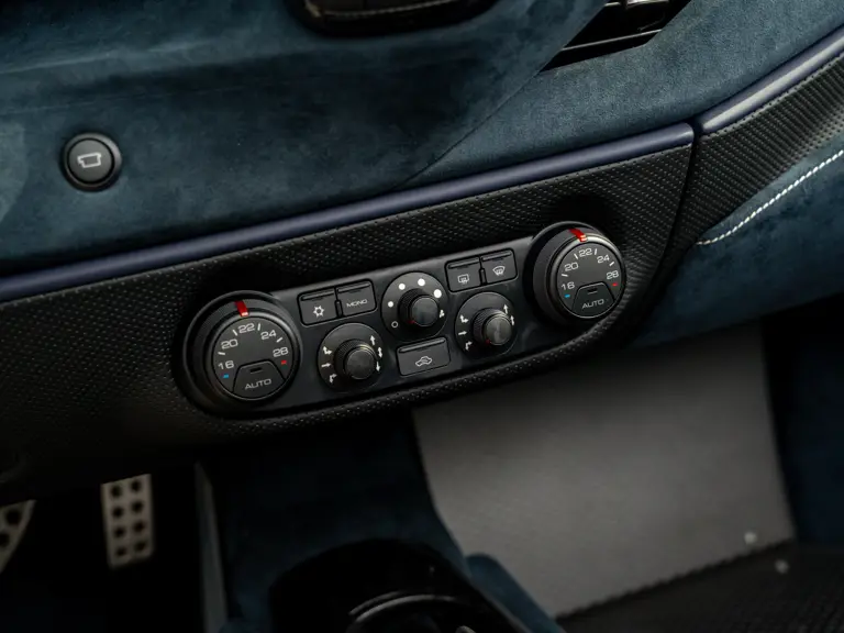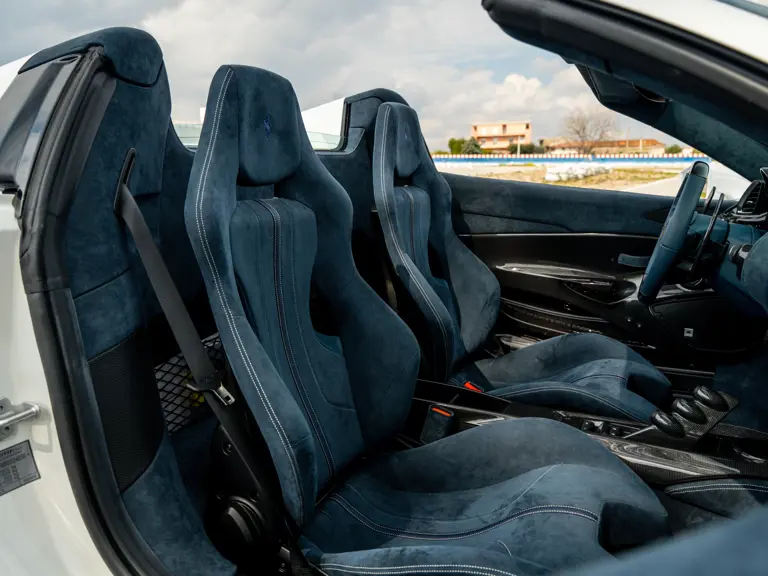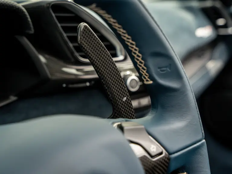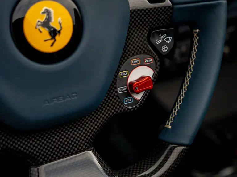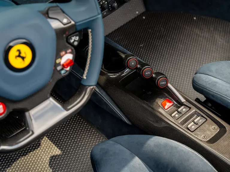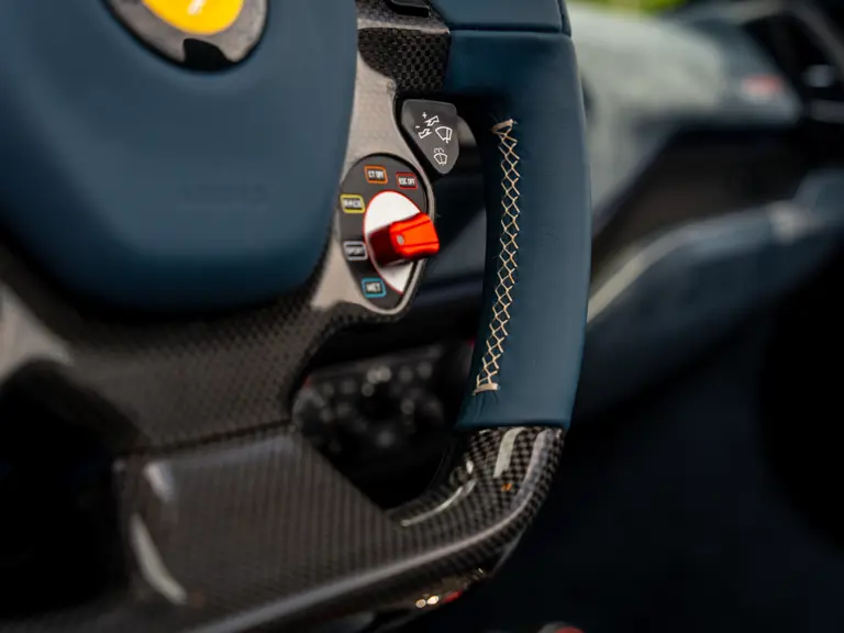 The attention to detail continues inside the car. In line with the Pista’s track-focused nature, the seating surfaces are swathed in Alcantara with medium blue inserts and light grey contrast stitching. These carbon fibre racing seats further feature the famous Prancing Horse silhouette in matching medium blue embroidery. Even the steering wheel, which features Ferrari’s signature “Manettino” drive mode selector dial, is trimmed in medium blue and perfectly frames the yellow tachometer.