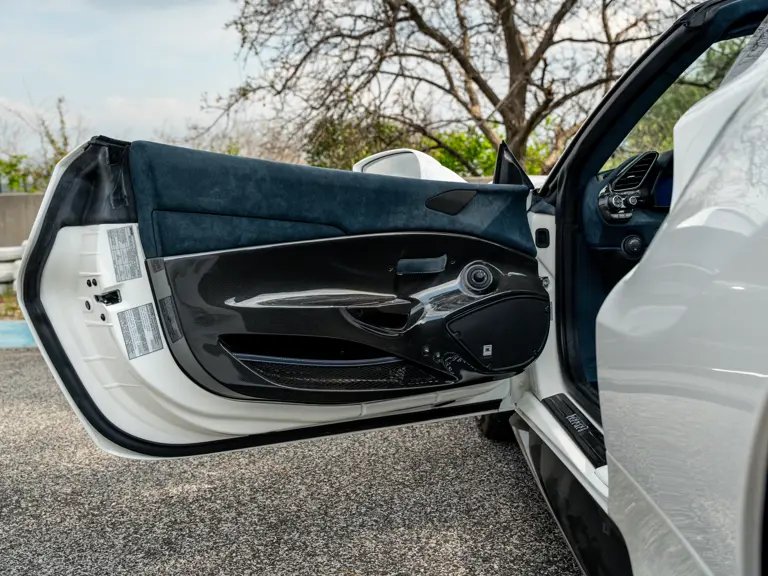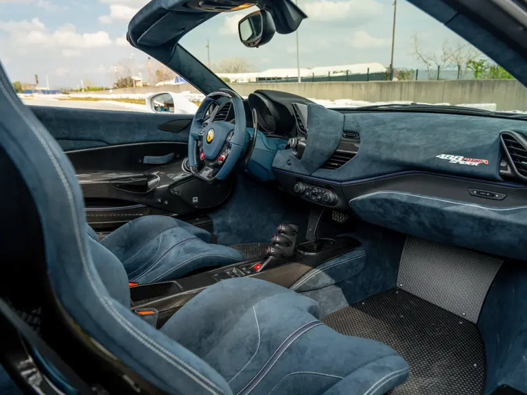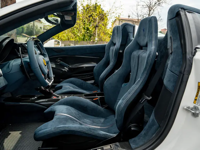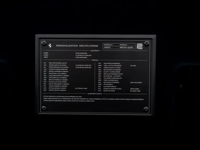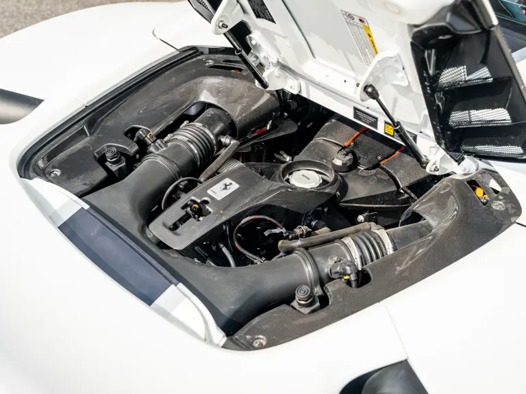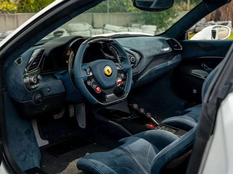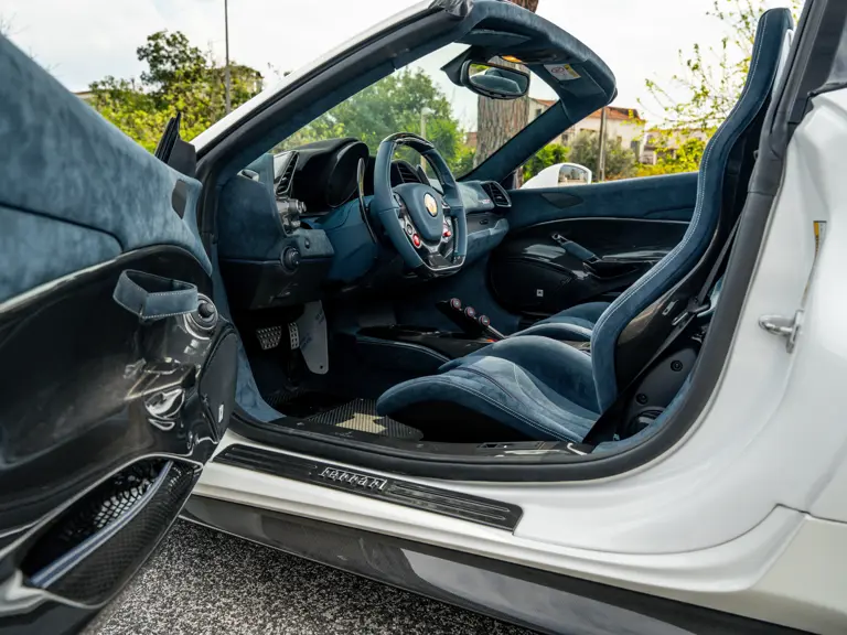 This 488 Pista Spider was ordered with an enviable and extravagant slate of distinctive options. Its attractive livery of Bianco King is contrasted with Nürburgring Silver and America Blue extended racing stripes, while the flanks bare the iconic Scuderia Ferrari shields. Perhaps the most outstanding element of this 488 Pista Spider, carbon fibre options were selected across the vehicle including side air splitters, rear diffuser, wheel caps, rocker panel trim, engine bay trim, door sills, and a spectacular amount of the interior trim.