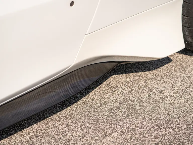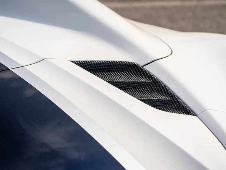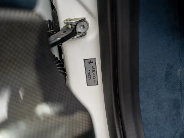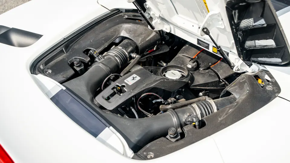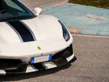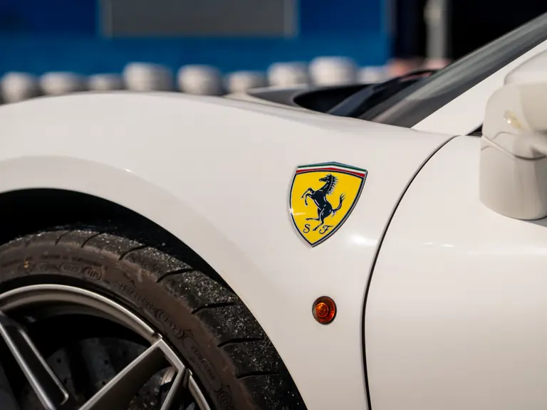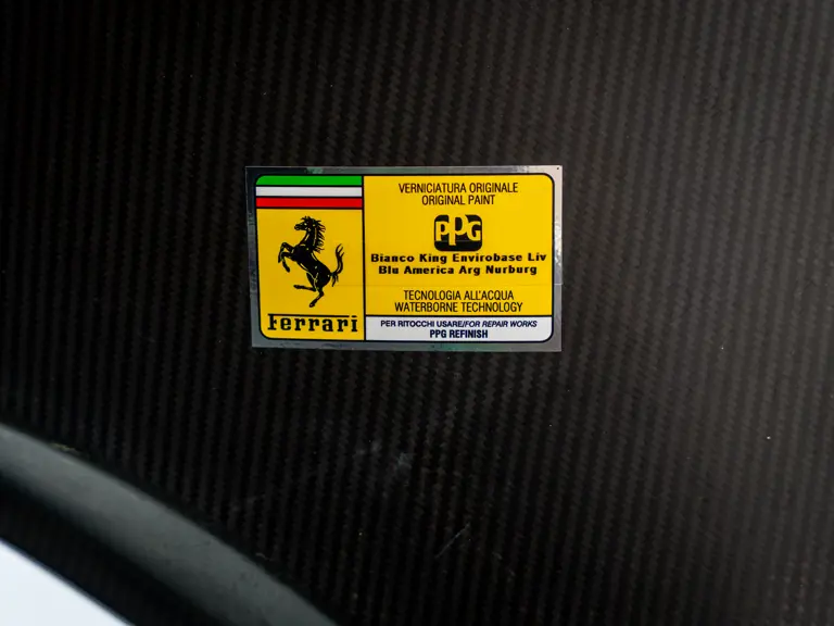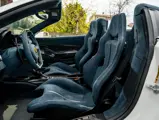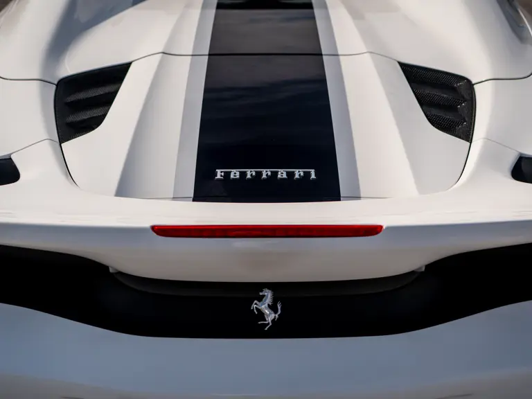 This 488 Pista Spider was ordered with an enviable and extravagant slate of distinctive options. Its attractive livery of Bianco King is contrasted with Nürburgring Silver and America Blue extended racing stripes, while the flanks bare the iconic Scuderia Ferrari shields. Perhaps the most outstanding element of this 488 Pista Spider, carbon fibre options were selected across the vehicle including side air splitters, rear diffuser, wheel caps, rocker panel trim, engine bay trim, door sills, and a spectacular amount of the interior trim.