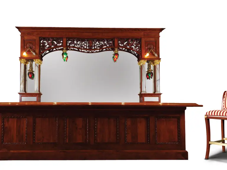 The lovely bar offered here was purchased by the Milhous brothers at auction and subsequently restored to its present condition. When purchased, the Alabaster columns were painted and the marble badly stained, however, these components were all perfectly restored and are now highlights of the back bar's construction and restoration. Illumination for the back bar is provided by four red and green tulip glass shades signed "Handel" and a pair of lovely two-light sconces mounted out of lion's mouths on each side. It has a large one-piece glass back which highlights the extensive ornamental wood lattice carving across the top. The back bar measures approximately 144 in. across and is nearly eight feet tall. The front portion of the bar is of new construction but matches quite well and measures almost 163 in. long.