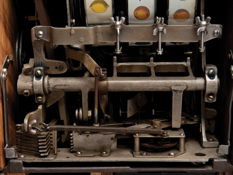 Slot machine with wood casing that appears original as does the cast iron front portion, which displays the script "1776" by the coin feeder slot. Includes a custom oak base with brass feet and an art nouveau brass plate mounted on the front. Very good condition, features a lot of original parts and is operational. 16x25x15 inches.