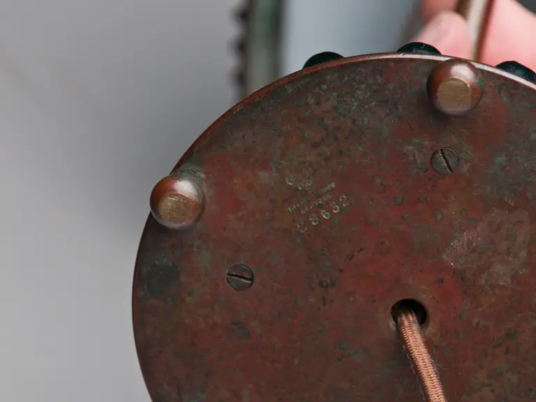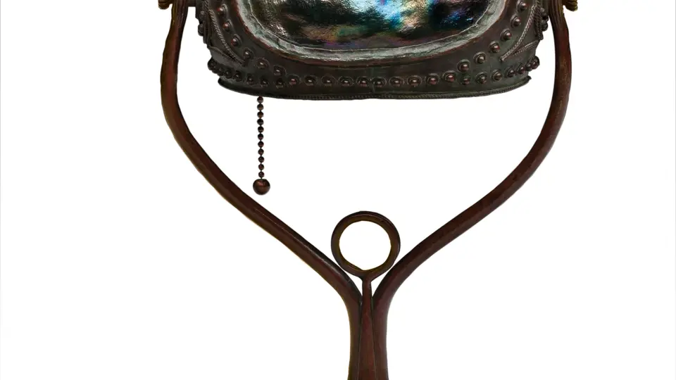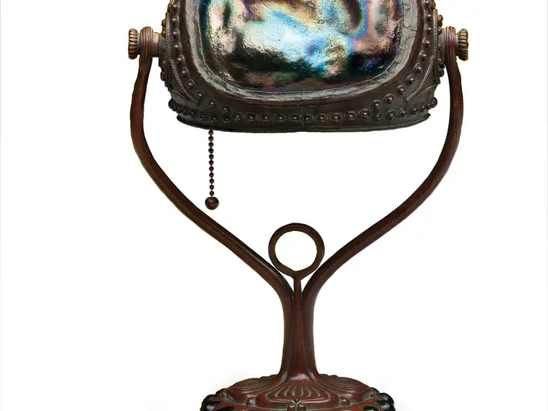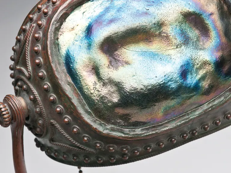 Circa 1910. Underside of the base stamped 'Tiffany Studios New York,' monogrammed and numbered, with a beaded shaped shade inset iridescent blue tiles. Condition is exemplary. 9x14.5 inches.