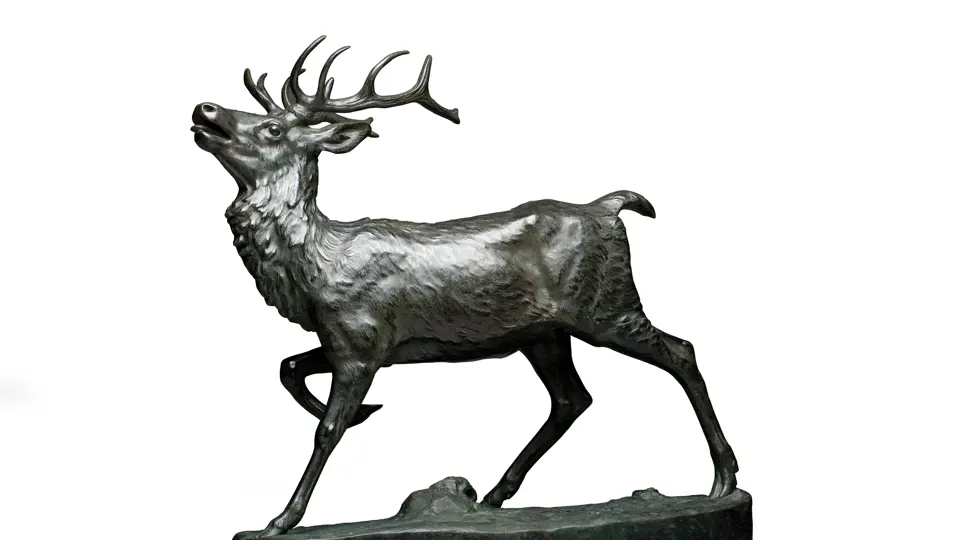 Circa 1875. Bronze sculpture with green patina of a baying stag by Antoine Louis Barye (French, 1795-1895). Inscribed 'Barye,' Susse Frères, Paris. Excellent overall condition, shows little wear or age throughout. 25x20x20 inches.