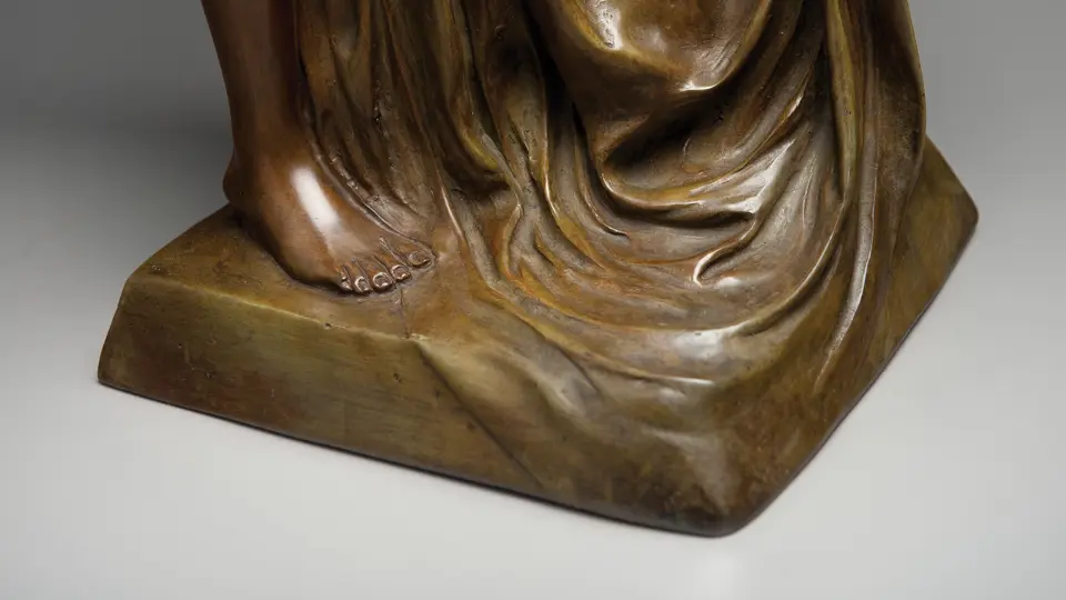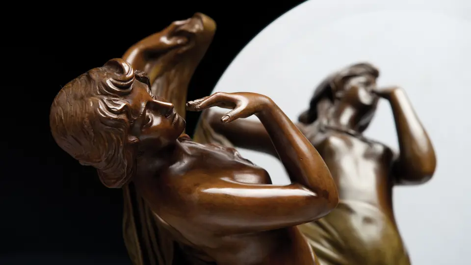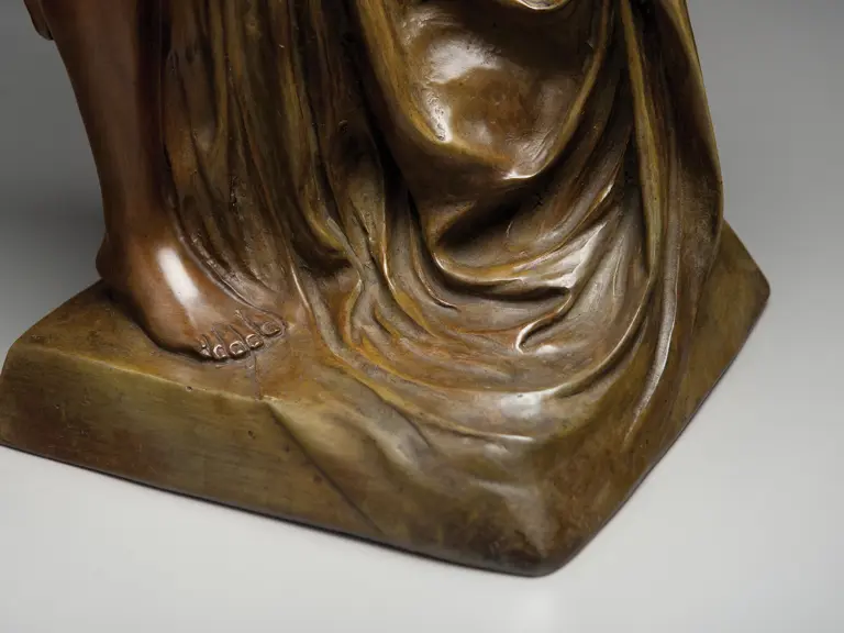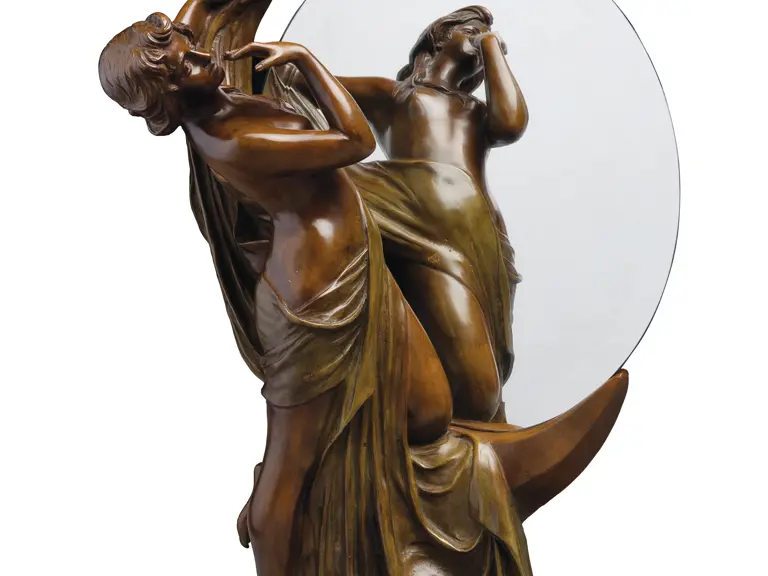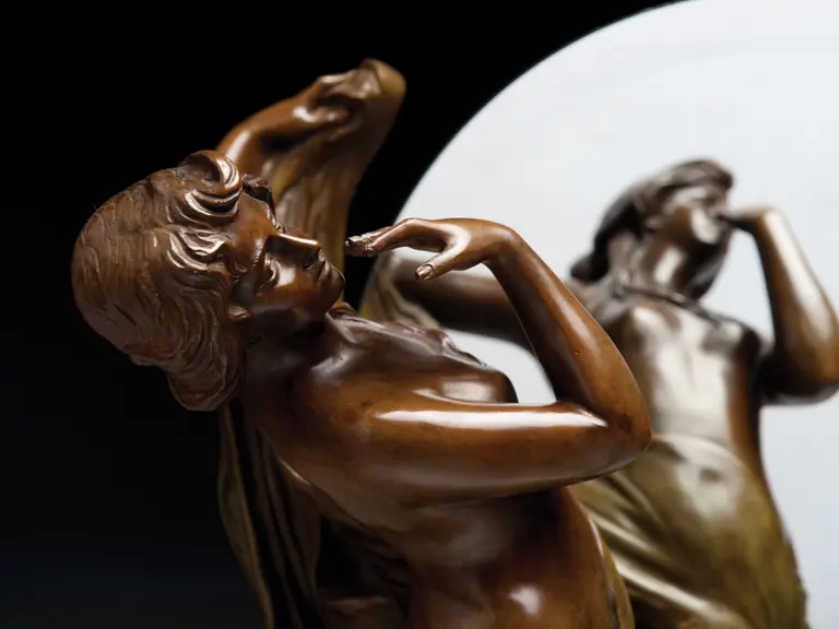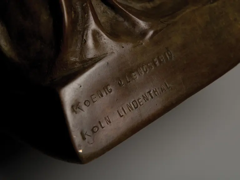 German, circa 1900. Patinated bronze, mirror inscribed Koenig & Lengsfeld, Koln-Lindenthal. Very presentable overall condition, shows virtually no wear. The mirror is in good condition as well. 20x29x11 inches.