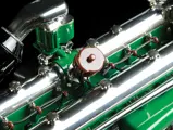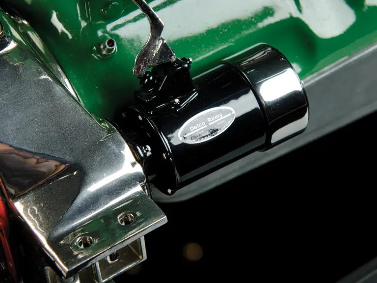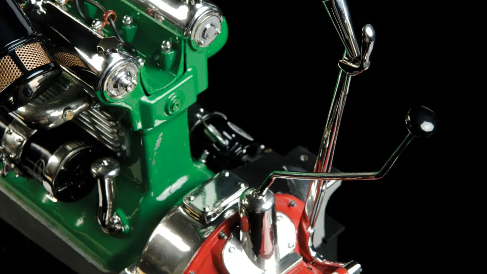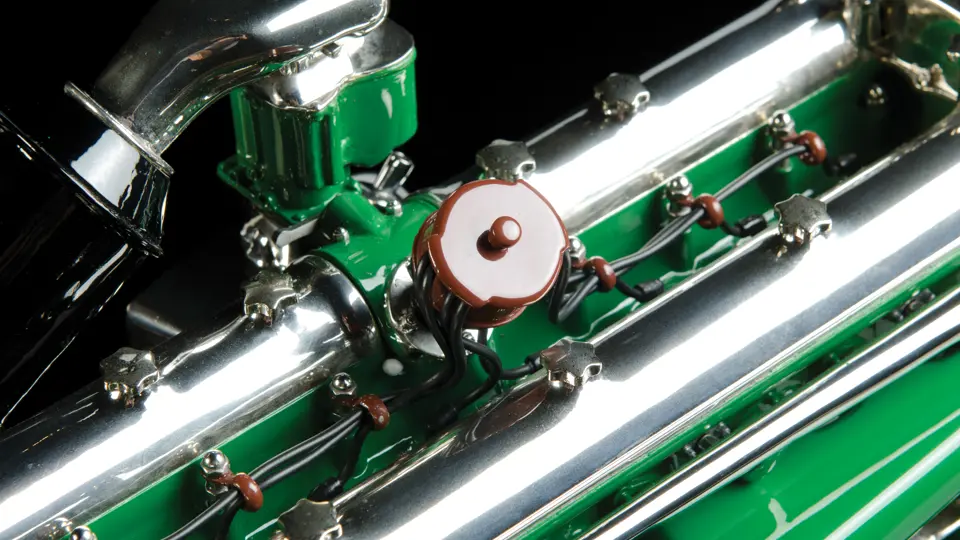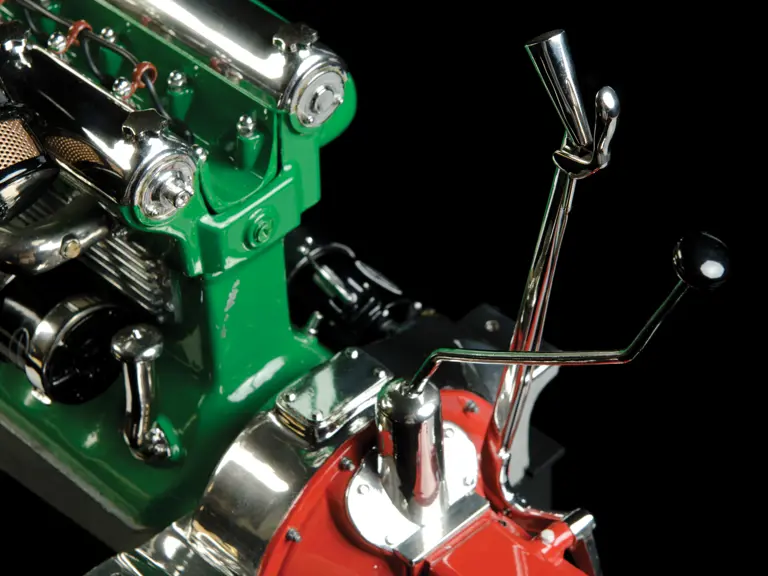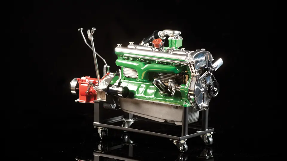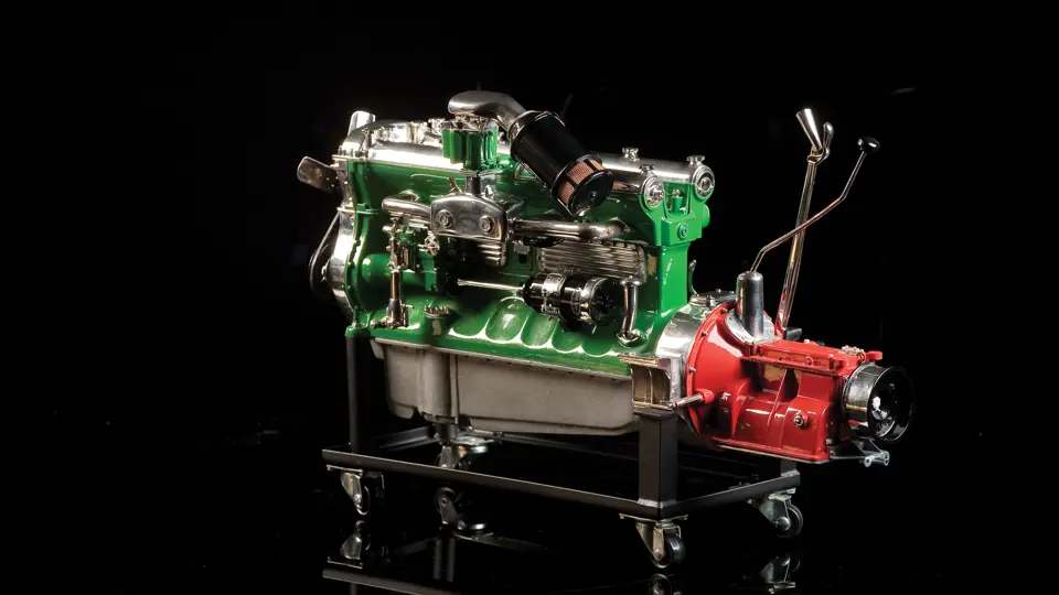Miniature Duesenberg engine by the company Retro 123. Features all the correct authentic details and is even mounted on a rolling stand with casters. Engine includes a manufacturer's tag with the numbers 031 and 175. Excellent overall condition, shows little to no wear whatsoever. 7x13x20 inches.