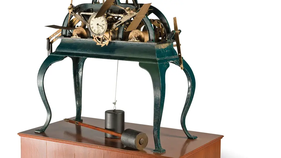 A triple train example with quarter-strike and Queen Anne-style legs, with pilot dial and one-second pendulum. 50x56x24 inches.