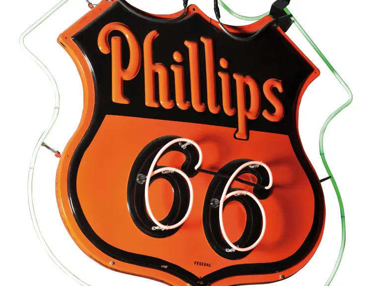 Neon; double-sided. Stunning example of the Phillips 66 shield. Surface has had some paint touch-up. 62x60 inches.