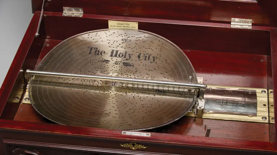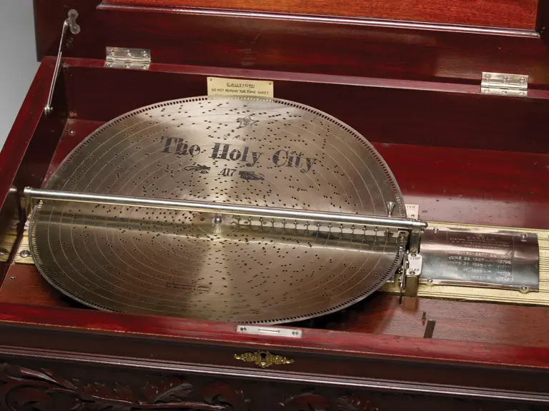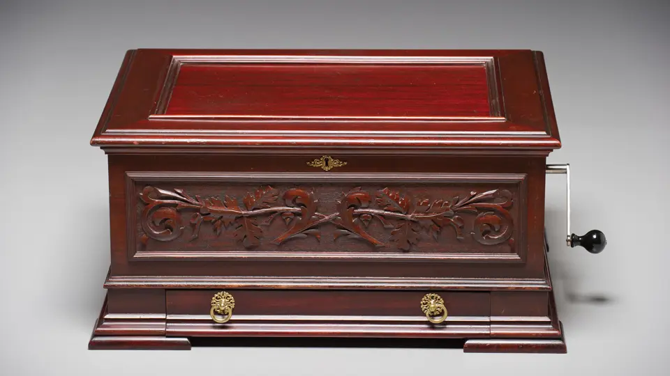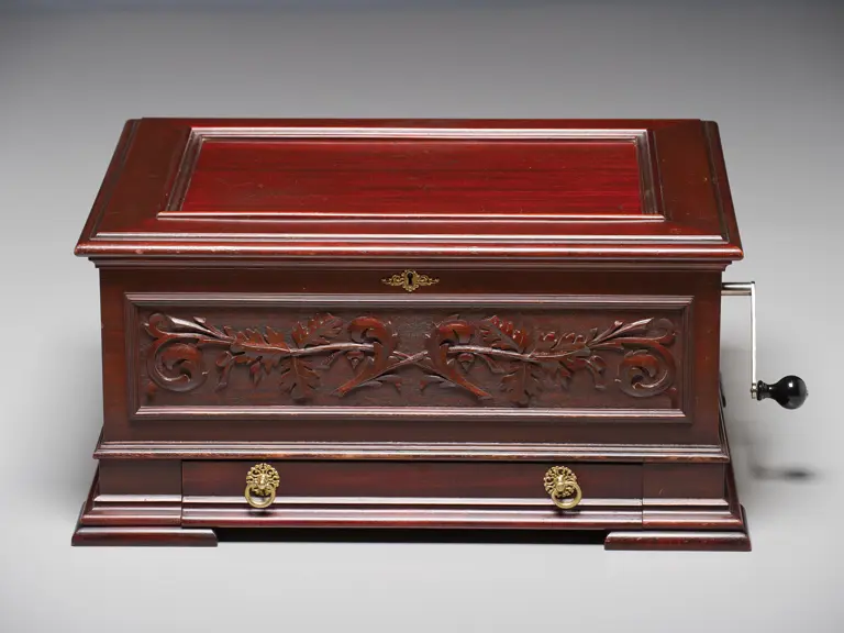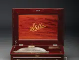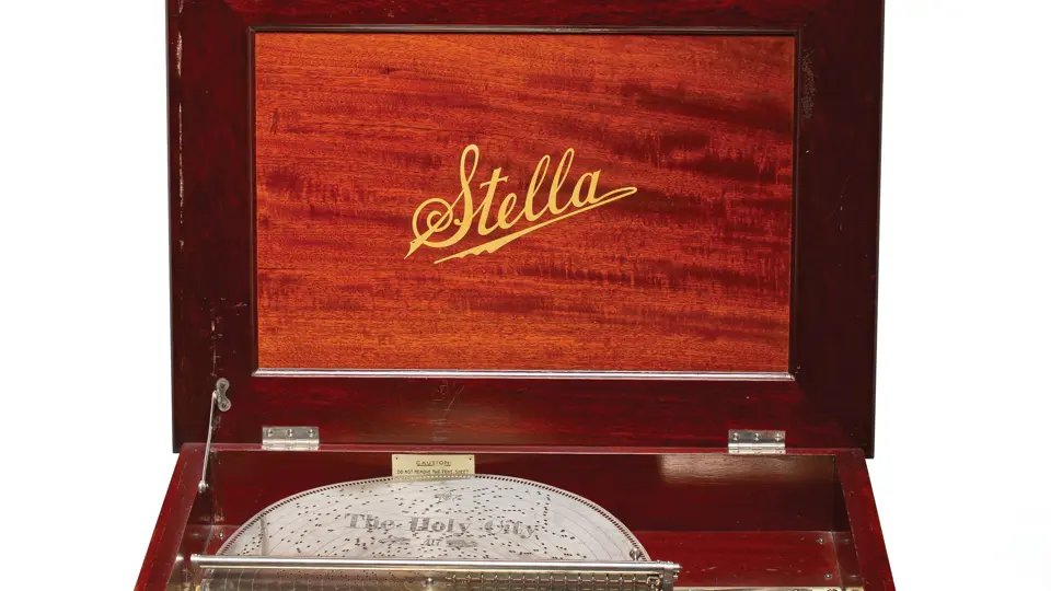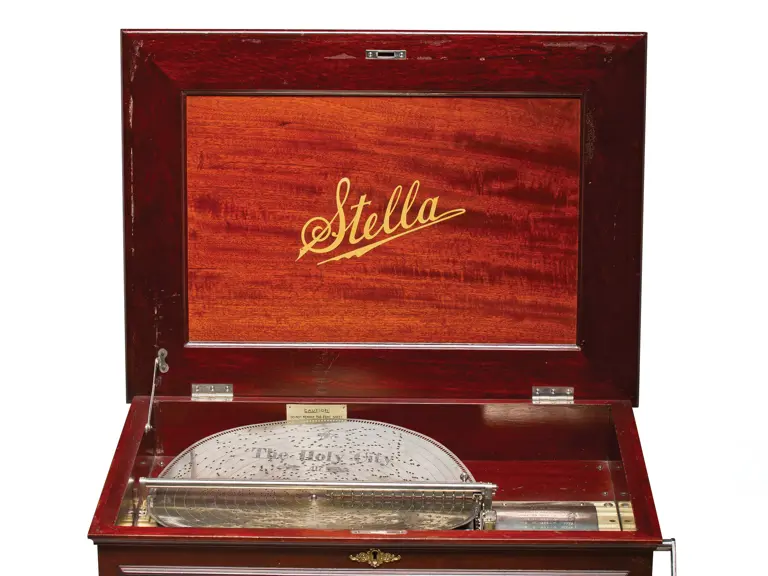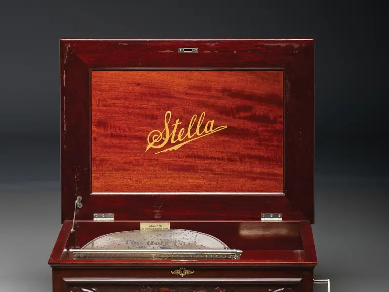 Of Swiss origin, this Stella music box is a single-comb example with a beautiful mahogany case. In working condition with a bottom drawer to hold the discs, it remains in lovely, presentable original condition. 43x43x28 inches.