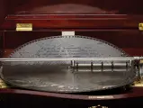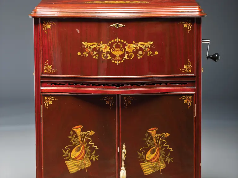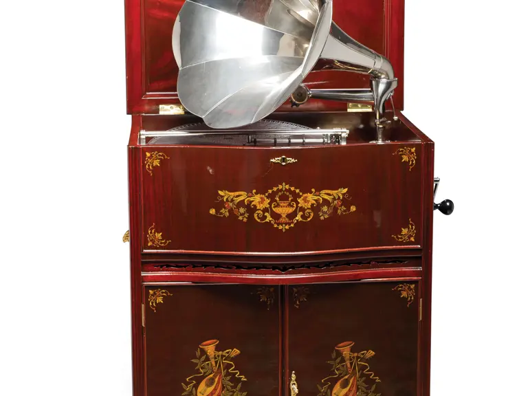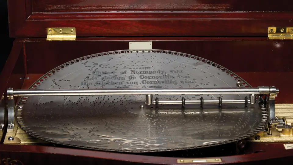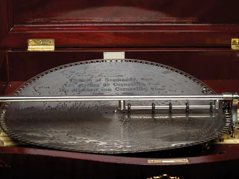 Of all disc-type music boxes made at the turn of the 20th century, one of the most desirable and of the finest quality today is the Mira. Made in St. Croix by Mermod Frères (Mermod Brothers), the Mira was introduced in 1903. The 18.5-inch disc is the largest size made by the firm. Today, perhaps 100 or so 18.5-inch Mira music boxes exist and are highly prized by collectors. Of these only a handful have a phonograph attachment, designating this as the Miraphone model, which permits 78 rpm records to be played if desired. For a fine home this was a high quality music box and a fine phonograph in a single unit. Competitors to this model included the Reginaphone line of the Regina Music Box Co. and the Polygraphon by the Polyphon Musikwerke.
