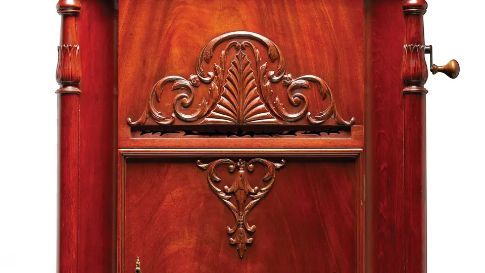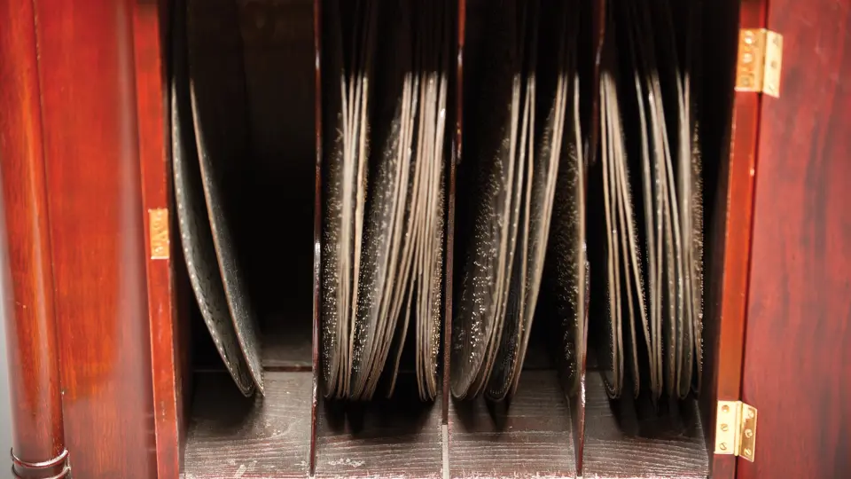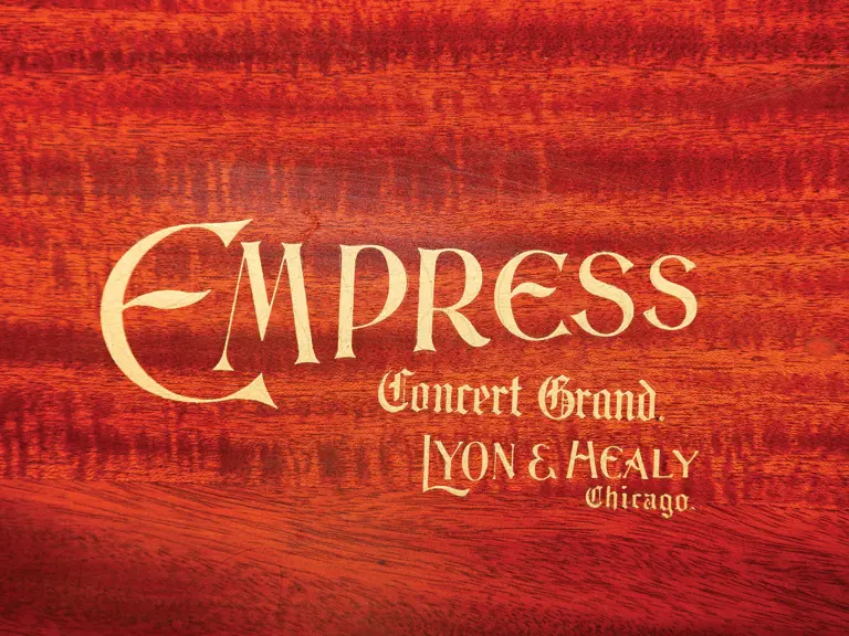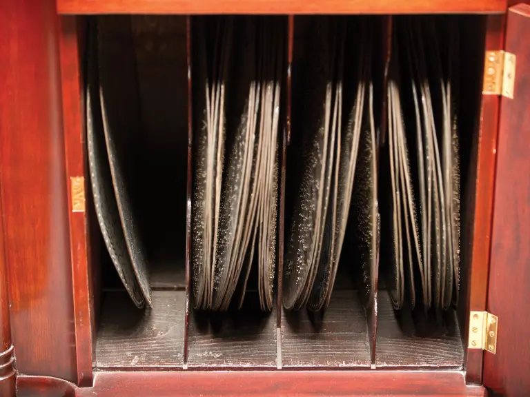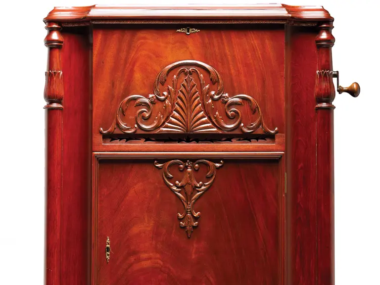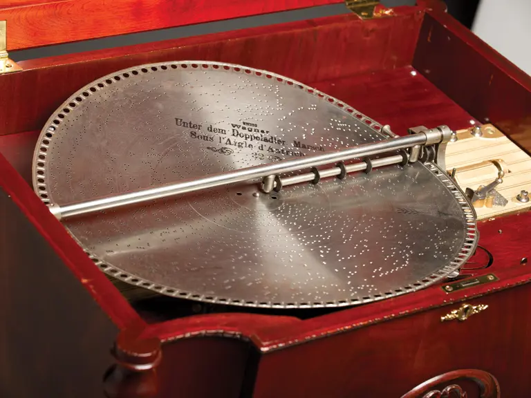 A very high quality example, this music box comes with a large quantity of discs. A double-comb example in rich mahogany, it was sold new by Lyon & Healy and remains in excellent overall condition Rich mahogany. A very high quality piece. 30x41x22 inches.